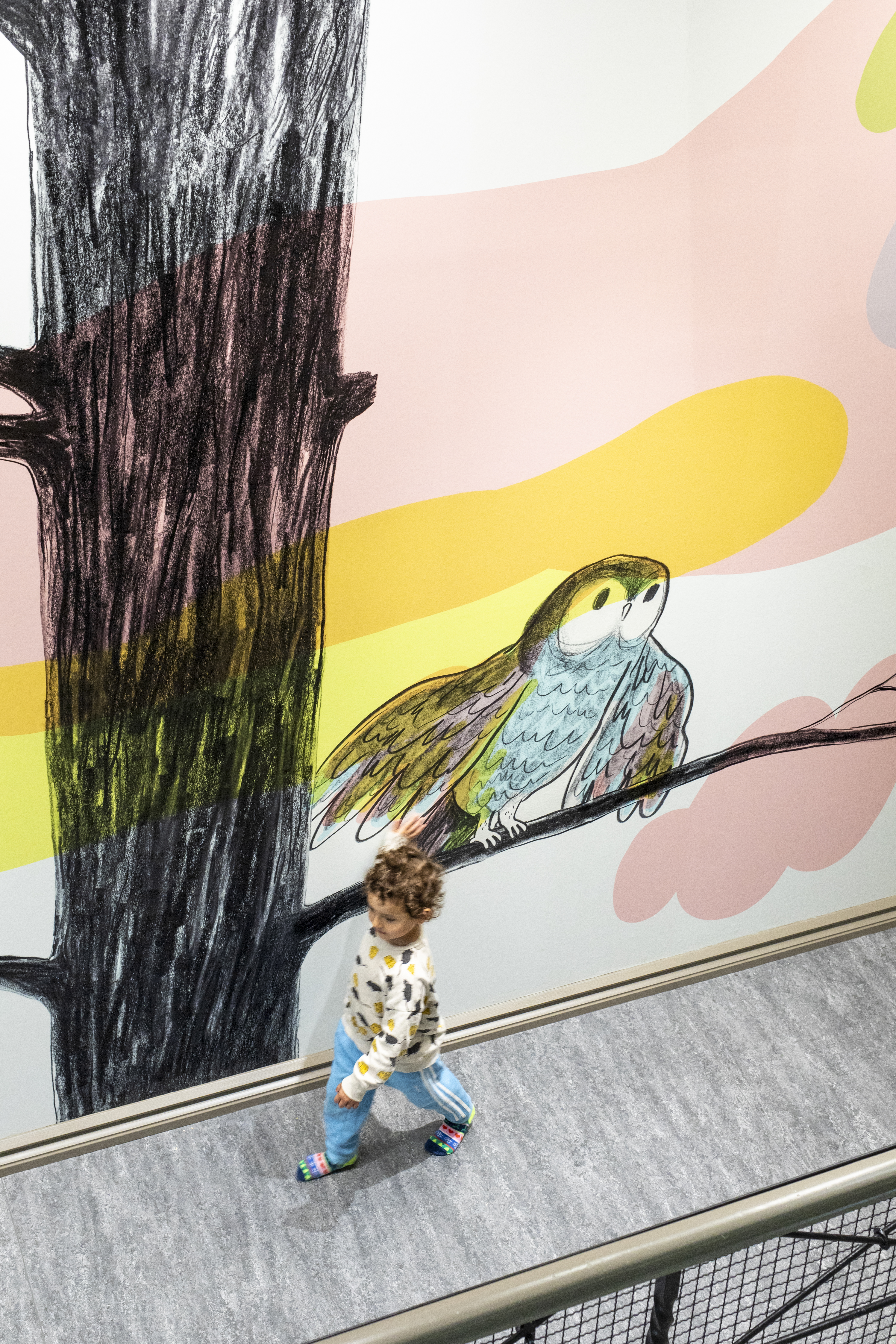 The work is like a story unfolding as children move from floor to floor. Each floor has its own small ecosystem and reality, with a different animal taking the lead. By recognising the signature animal children can easily remember their own group’s home floor.