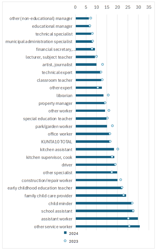 Since 2023, municipal employees, apart from Helsinki, have no longer included personnel from health care, social welfare and rescue services, which has a partial impact on the figures.