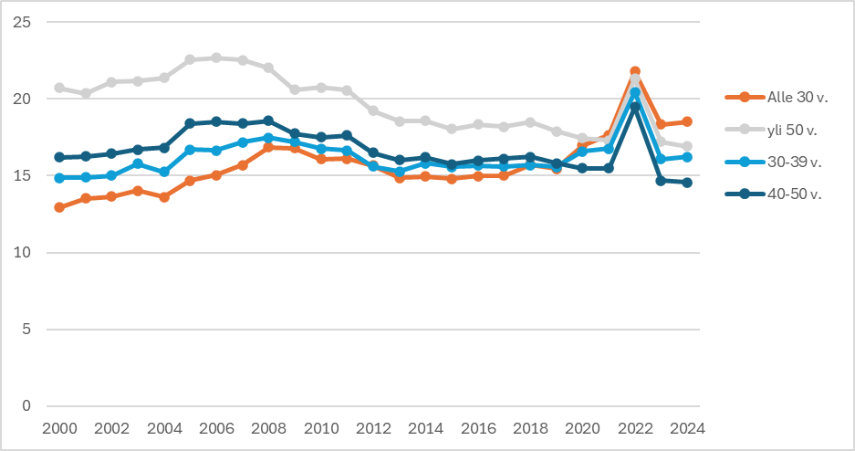 Alle 30-vuotiaiden kuntatyöntekijöiden sairauspoissaolot osoittavat yhä huolestuttavaa kehitystä. Vaikka koronapandemian aikainen piikki tasoittui, nuorten poissaolot ovat selvästi yleisempiä kuin heitä vanhemmissa ikäryhmissä (katso kuvio 1).