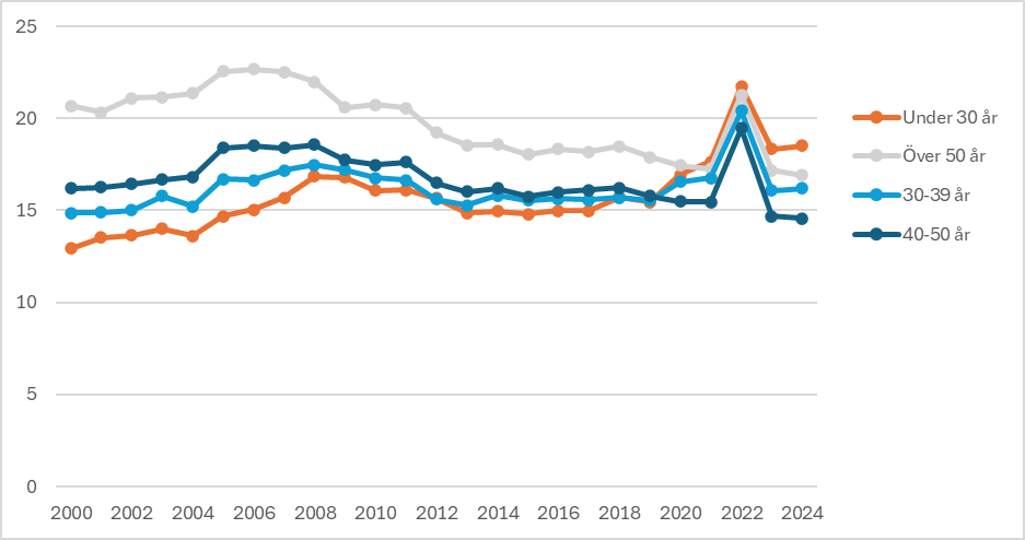 Sjukfrånvaron bland kommunalt anställda under 30 år visar fortfarande en oroväckande utveckling. Trots att toppen under coronapandemin utjämnades, är frånvaron bland unga betydligt vanligare än i äldre åldersgrupper (se figur 1).