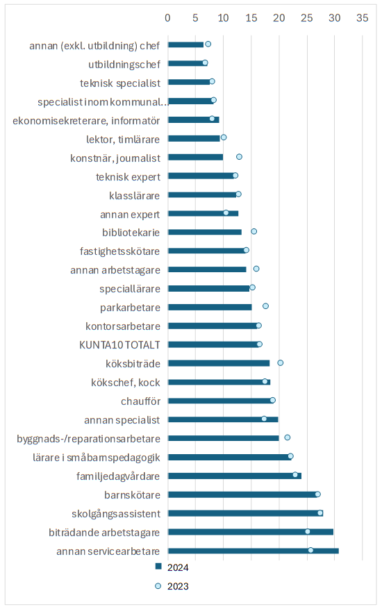 Sjukfrånvaron varierar tydligt mellan yrkesgrupperna. Antalet frånvarodagar bland personer som arbetar i ledande roller och expertuppgifter var i genomsnitt sju dagar per årsverke åren 2023 och 2024, medan antalet bland personer i fysiskt och utförande arbete ökade till upp till 30 dagar.