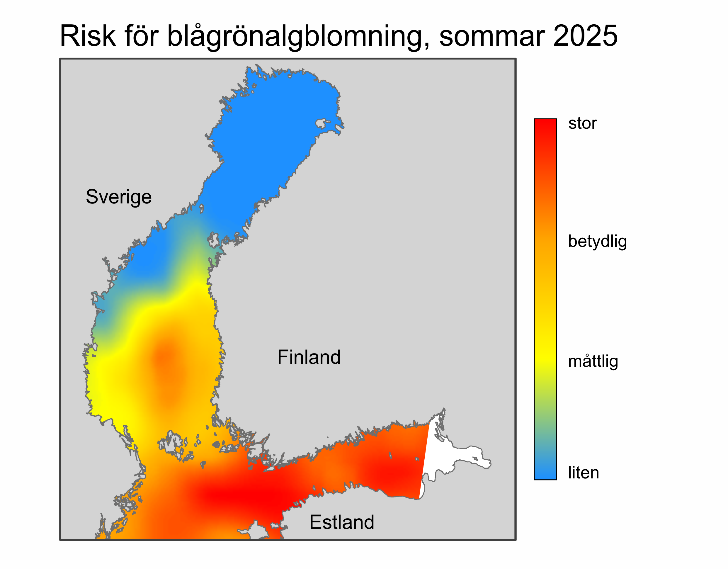 Risken är stor för att bälten av cyanobakterier bildas i norra delen av Östersjöns huvudbassäng, Finska viken, Skärgårdshavet och en stor del av Bottenhavet. I Bottenviken är risken fortfarande liten. Det vita området har inte bedömts, eftersom inga uppgifter om vinterns näringssituation finns tillgängliga från området. Finlands miljöcentral