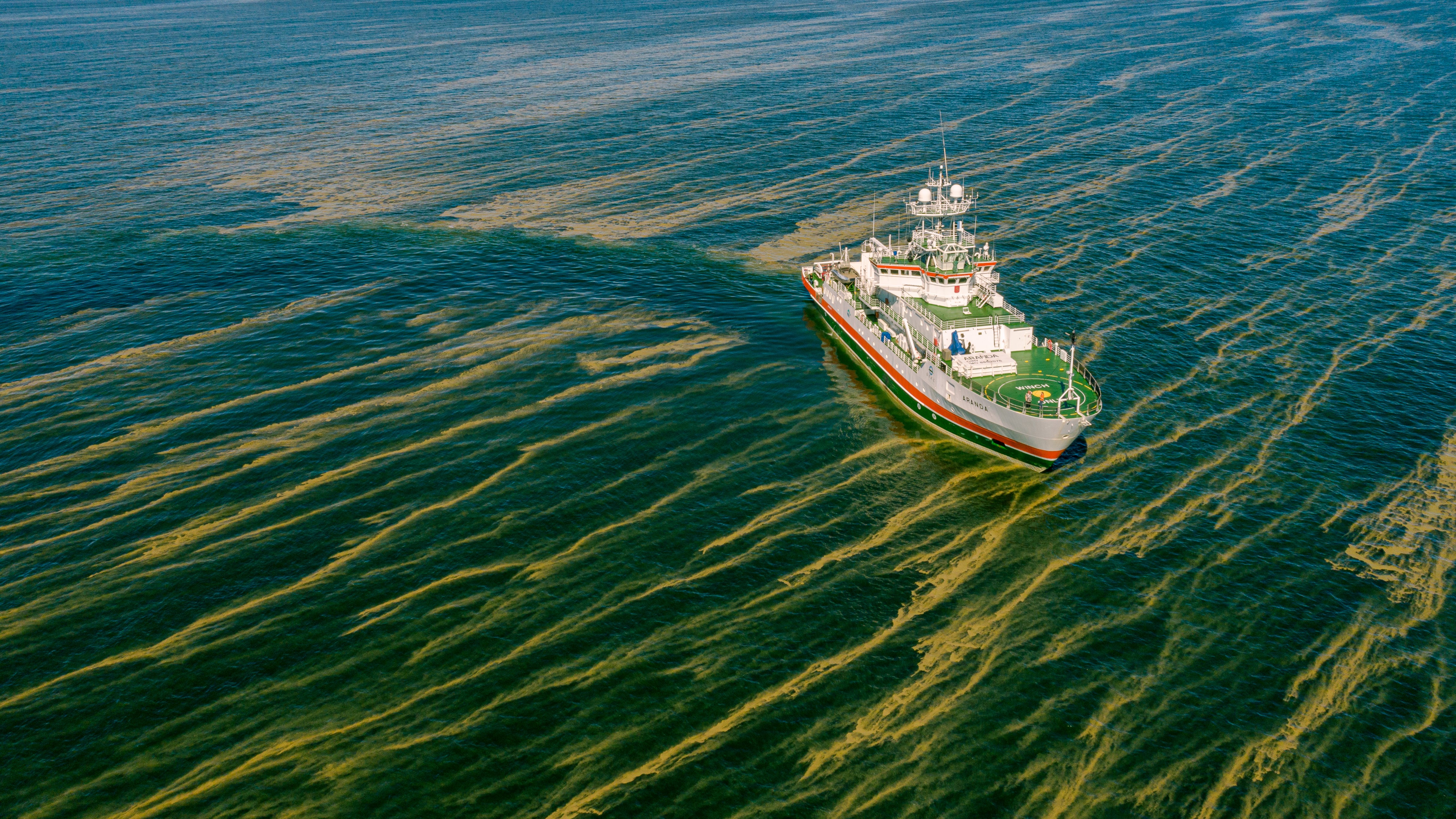 Large blue-green algae blooms usually begin to occur in the open sea area after Midsummer. Rafts of blue-green algae form in the open sea following a period of warm and sunny weather of a couple of weeks, especially if it includes a few days of slack winds. In summer, strong northerly winds may cause an upwelling of phosphorus-rich bottom water into the surface layer, which may contribute to blue-green algae growth.