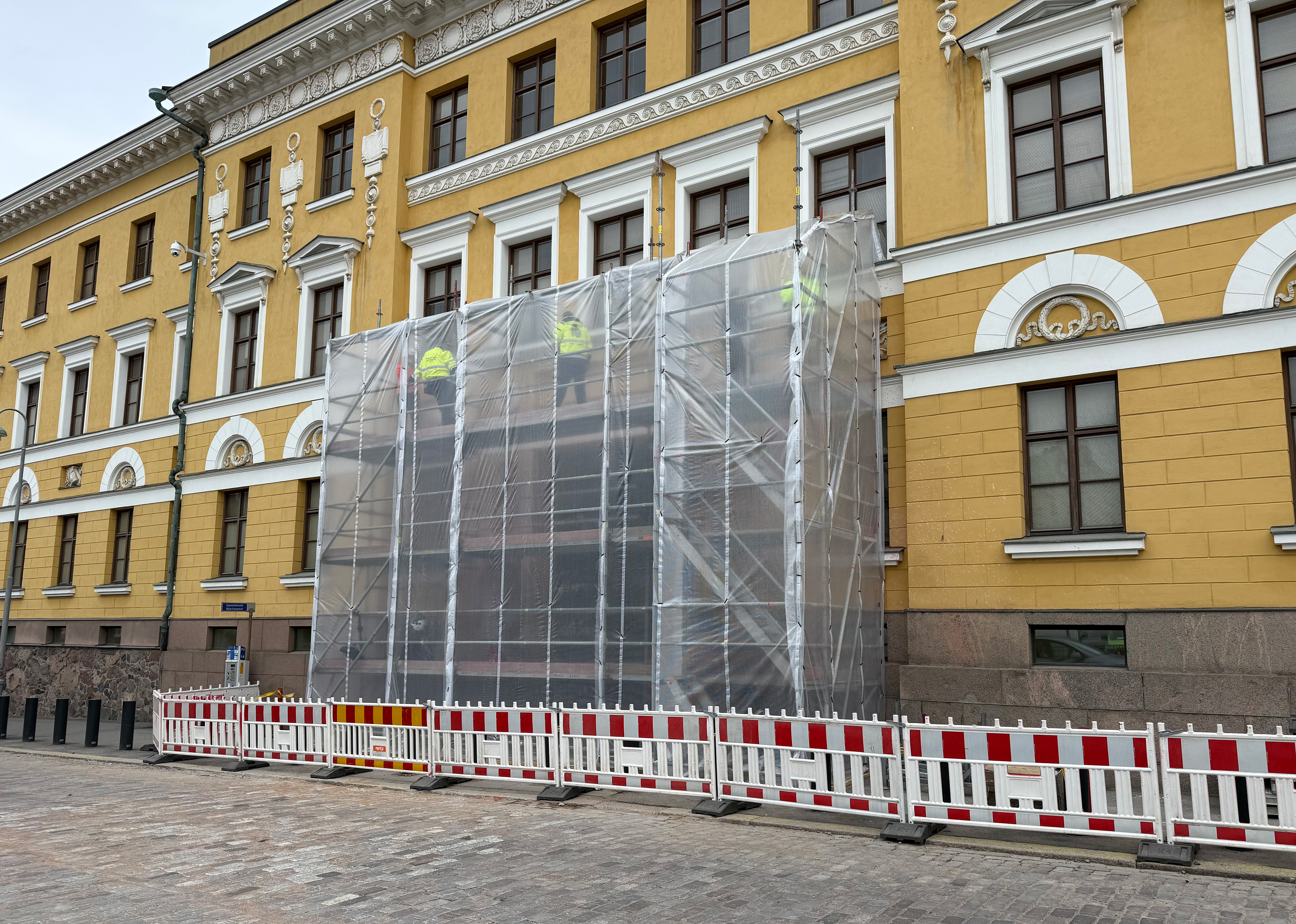 Puolustusministeriön töhrittyjen tilojen puhdistaminen etenee suunnitelmallisesti. Puolustuskiinteistöt on viikonlopun aikana suojannut Helsingin Kaartinkaupungissa sijaitsevan rakennuksen sisäänkäynnin sääsuojilla, ja puhdistustyöt on käynnistetty.