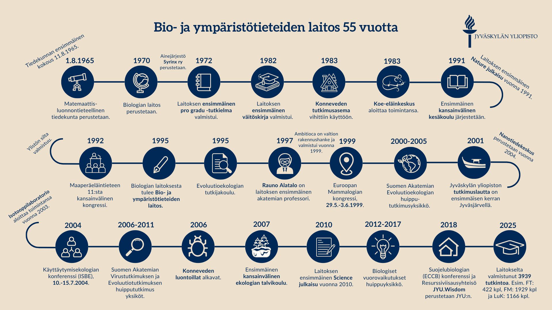 Jyväskylän yliopiston bio- ja ympäristötieteiden laitos on kasvanut 55 vuodessa Jyväskylän yliopiston suurimmaksi laitokseksi ja vakiinnuttanut asemansa kansallisesti ja kansainvälisesti arvostettuna tutkimus- ja koulutusyksikkönä biotieteissä ja ympäristötieteessä. Laitoksen korkealaatuinen ja monipuolinen tutkimus, verkostoituminen muiden yliopistojen ja alan tutkimuslaitosten kanssa sekä opetuksen jatkuva kehittäminen ovat vuosien varrella olleet keskeisiä laitoksen vahvuuksia.