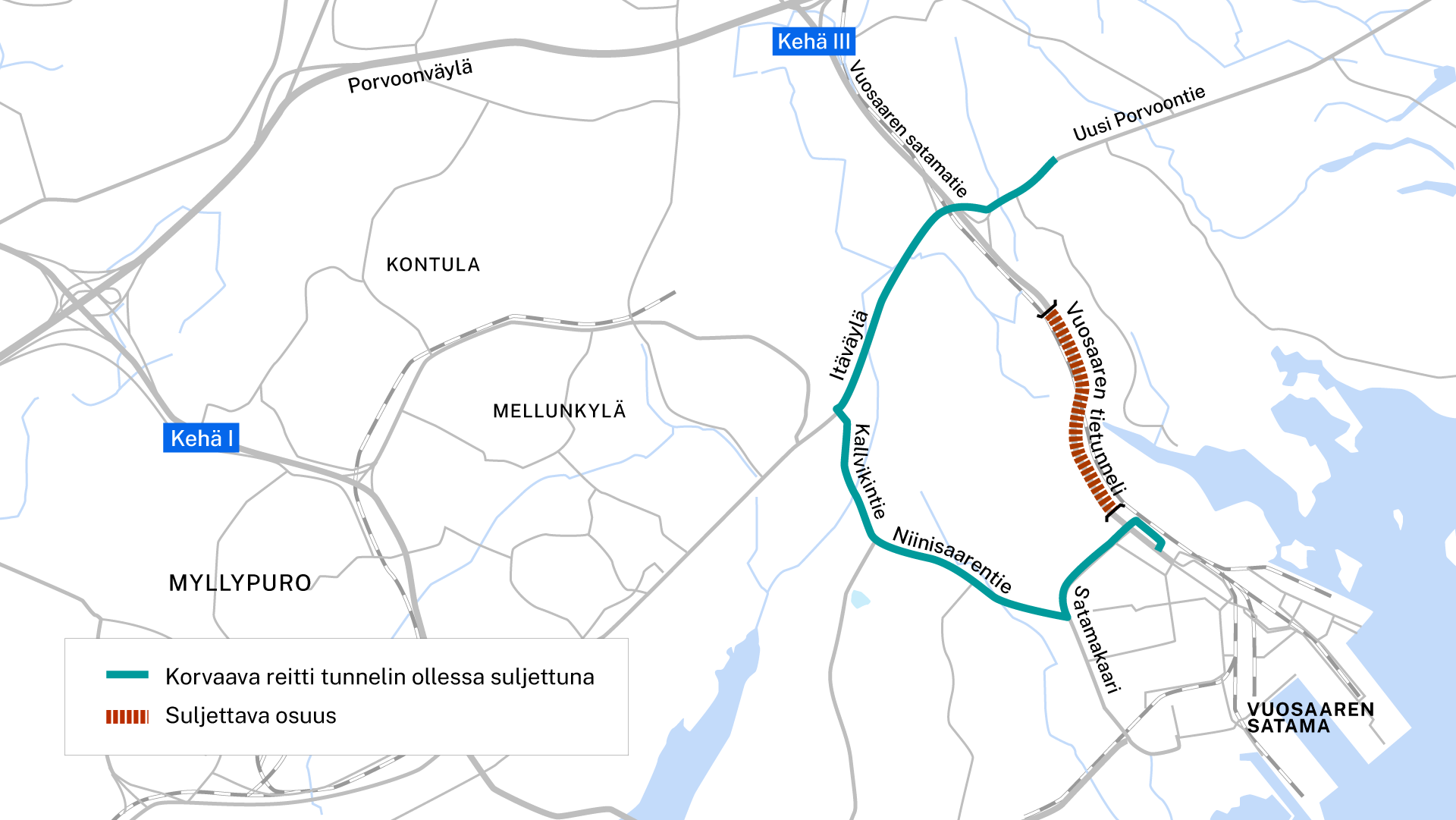 Vuosaaren tietunnelin varareitin parannukset on saatu valmiiksi, ja reitin toimivuutta testataan 16.6. klo 22–18.6. klo 22. Reitti kulkee Itäväylältä Kallvikintien ja Niinisaarentien kautta Vuosaaren satamaan. Testauksen tarkoituksena on varmistaa, että myös rekat voivat käyttää reittiä ongelmitta tunnelissa myöhemmin tänä vuonna alkavan saneerauksen aikana. Vuosaaren tunneli suljetaan liikenteeltä testauksen ajaksi, ja kaikki liikenne ohjataan varareitille. Itse testauksesta ei aiheudu liikenteelle haittaa varareitillä.