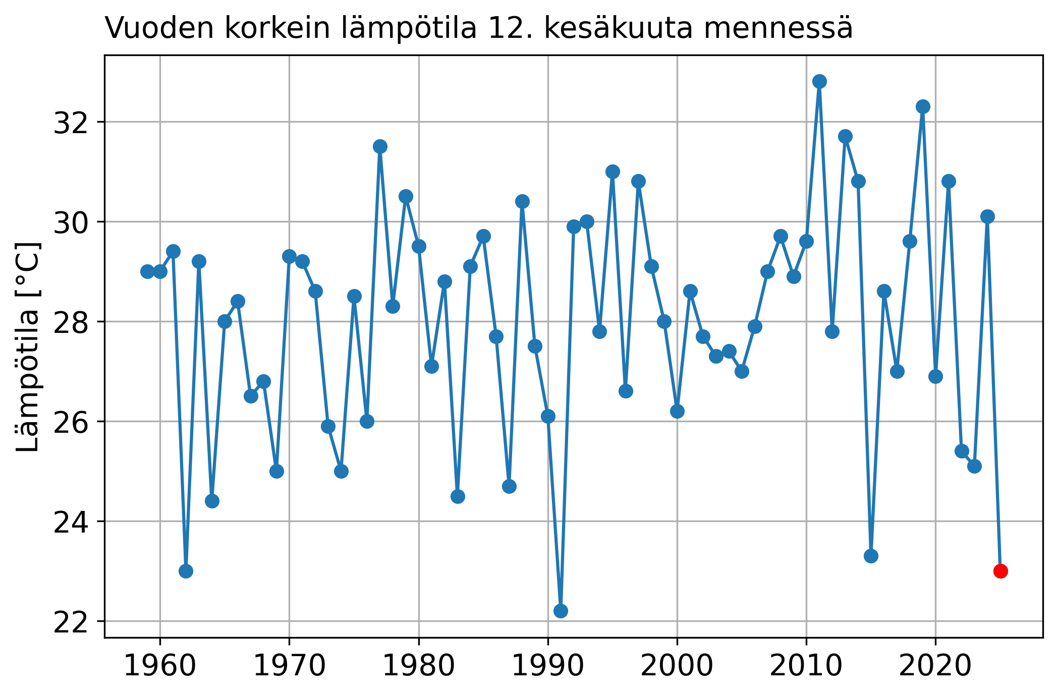 Kuluvan kesän korkein lämpötila on ollut tähän mennessä 23,0 astetta, joka mitattiin 25. toukokuuta Ilomantsissa. Viimeisen 67 vuoden aikana kesäkuun 12. päivään mennessä ylin lämpötila on jäänyt alhaisemmaksi ainoastaan vuonna 1991.