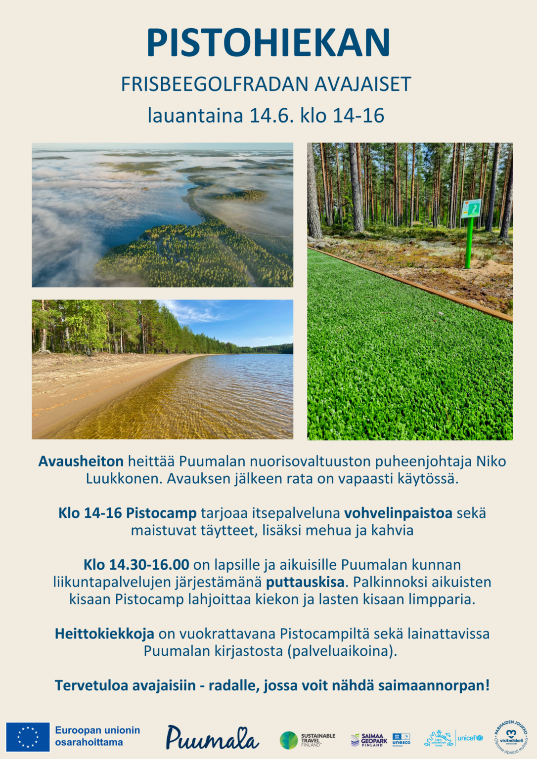 - Klo 14.30-16.00 on lapsille ja aikuisille Puumalan kunnan liikuntapalvelujen järjestämänä puttauskisa. Palkinnoksi aikuisten kisaan Pistocamp lahjoittaa kiekon ja lasten kisaan limpparia.