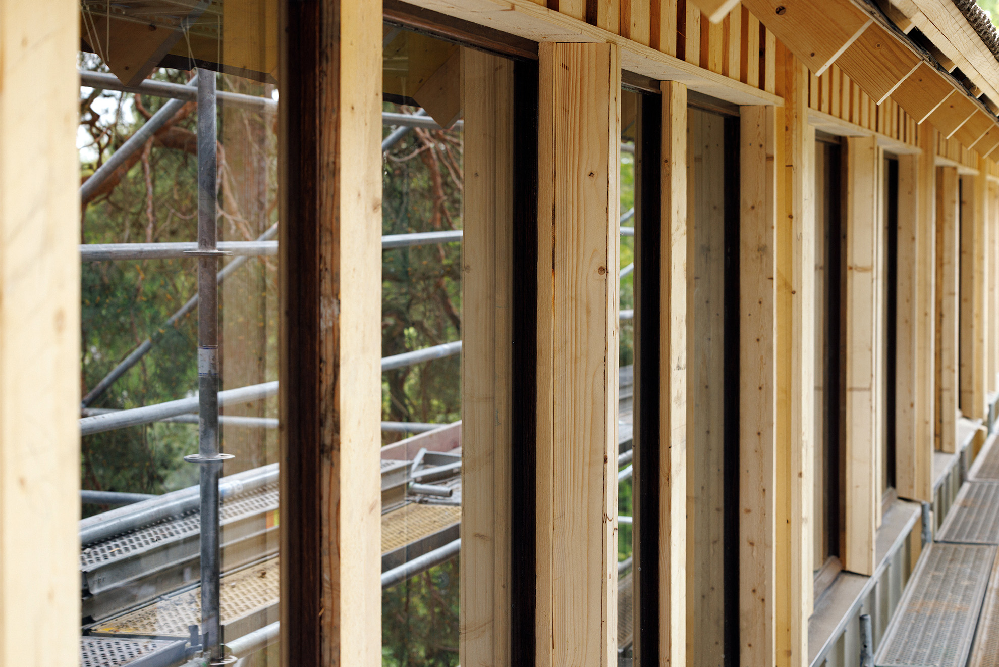 Det återanvända byggnadsmaterialet ger byggnaden en egen, vacker estetik.