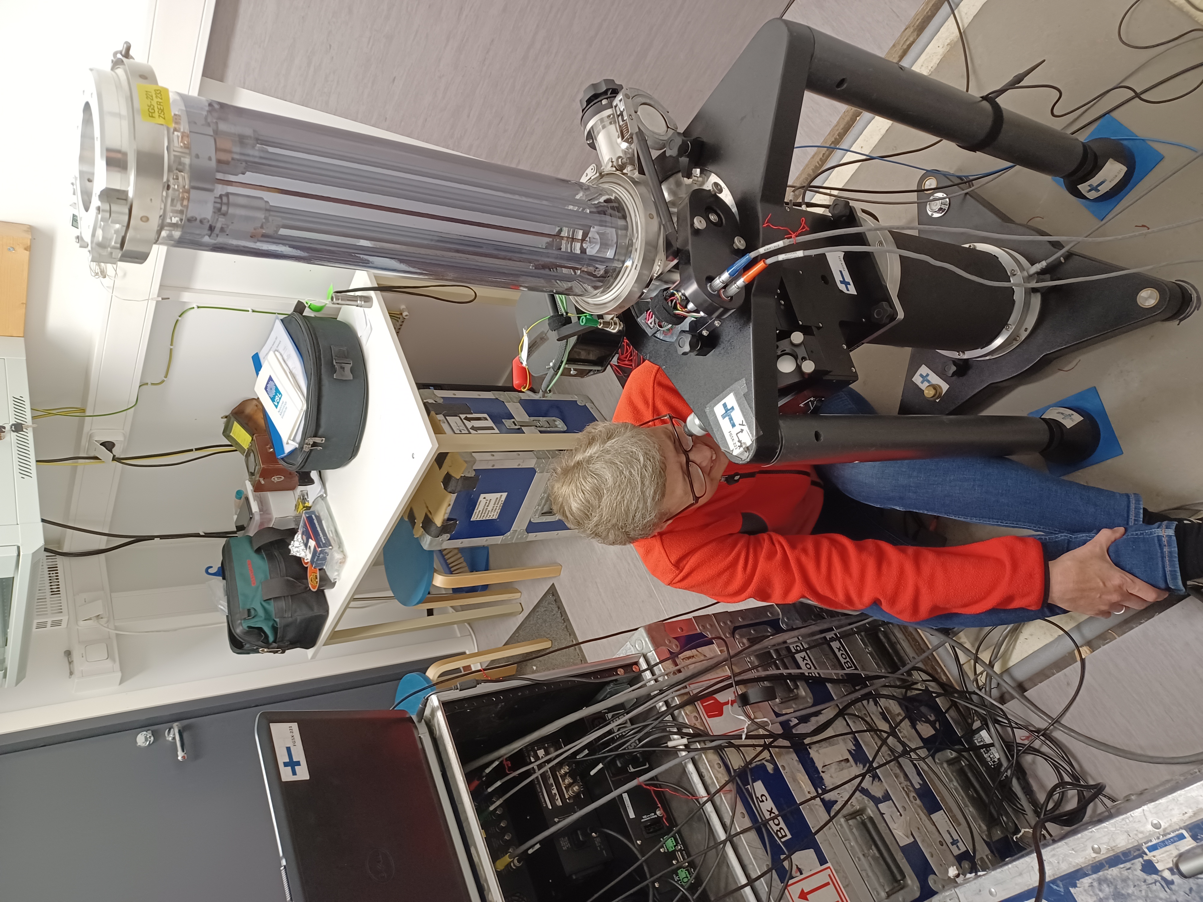 Maanmittauslaitoksen tutkimuspäällikkö Mirjam Bilker-Koivula mittaamassa painovoimaa absoluuttigravimetrillä.