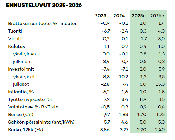Suomen bruttokansantuotteen kasvu jää tänä vuonna supistuvan yksityisen kulutuksen painamana hyvin vaatimattomaksi, vain 0,1 prosenttiin. Ensi vuoden puolen välin tienoilla talousnäkymät alkavat kirkastua Euroopan kiihtyvän talouskasvun vanavedessä. Yksityinen kulutus kääntyy kasvuun ja investointikysyntä vahvistuu, erityisesti puolustussektorin panostusten myötä. Vuonna 2026 talouden ennakoidaan kasvavan 1,1 prosenttia. POP Pankin ennuste vuodelle 2026: BKT:n kasvu kiihtyy 1,1 prosenttiin 12 kuukauden Euriborin ennakoidaan olevan keskimäärin 2,3 prosenttia vienti kasvaa 2,7 prosenttia tuonti vauhdittuu 4,2 prosenttiin investoinnit siivittyvät 7,1 prosentin kasvuun; yksityisen kulutuksen arvioidaan kasvavan 0,6 prosenttia. inflaatio nousee 1,8 prosenttiin palkansaajien ostovoima paranee ensi vuonna 2,1 prosenttia työttömyysaste on vuonna 2026 keskimäärin 9,9 prosenttia ja 15–64-vuotiaiden työllisyysaste 71,6 prosenttia.