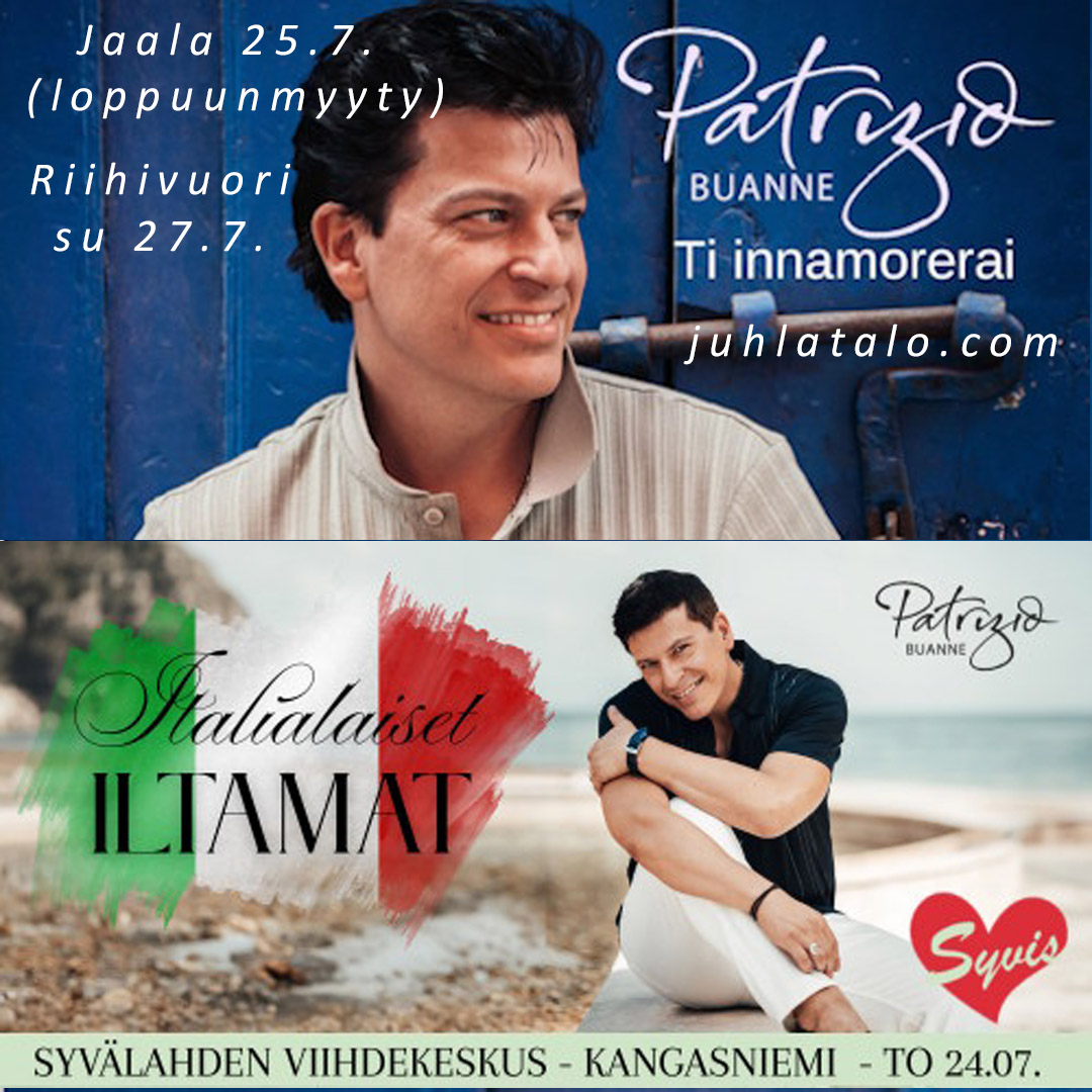 Baritoni-showmies Patrizio Buannen helmikuun loppuunmyydyt keikat Helsingissä, Turussa ja Jyväskylässä olivat huikea menestys. Niiden aikana murheet ja yksinäisyyden tunne olivat tiessään. Nyt Patrizion Italia-Suomi rakkaustarina saa jatkoa 23.-31.7., kun Patrizio viihdyttää meitä ja samalla tutustuu ensi kertaa perheensä kanssa upeaan kesäämme.