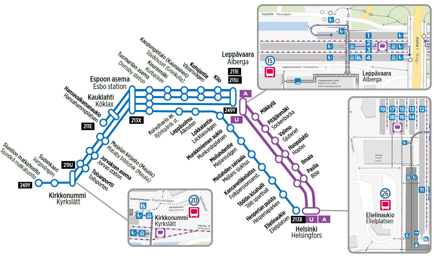 - 249Y Leppävaara–Turunväylä–Espoo–Kehä III–Kirkkonummi(–Siuntio)