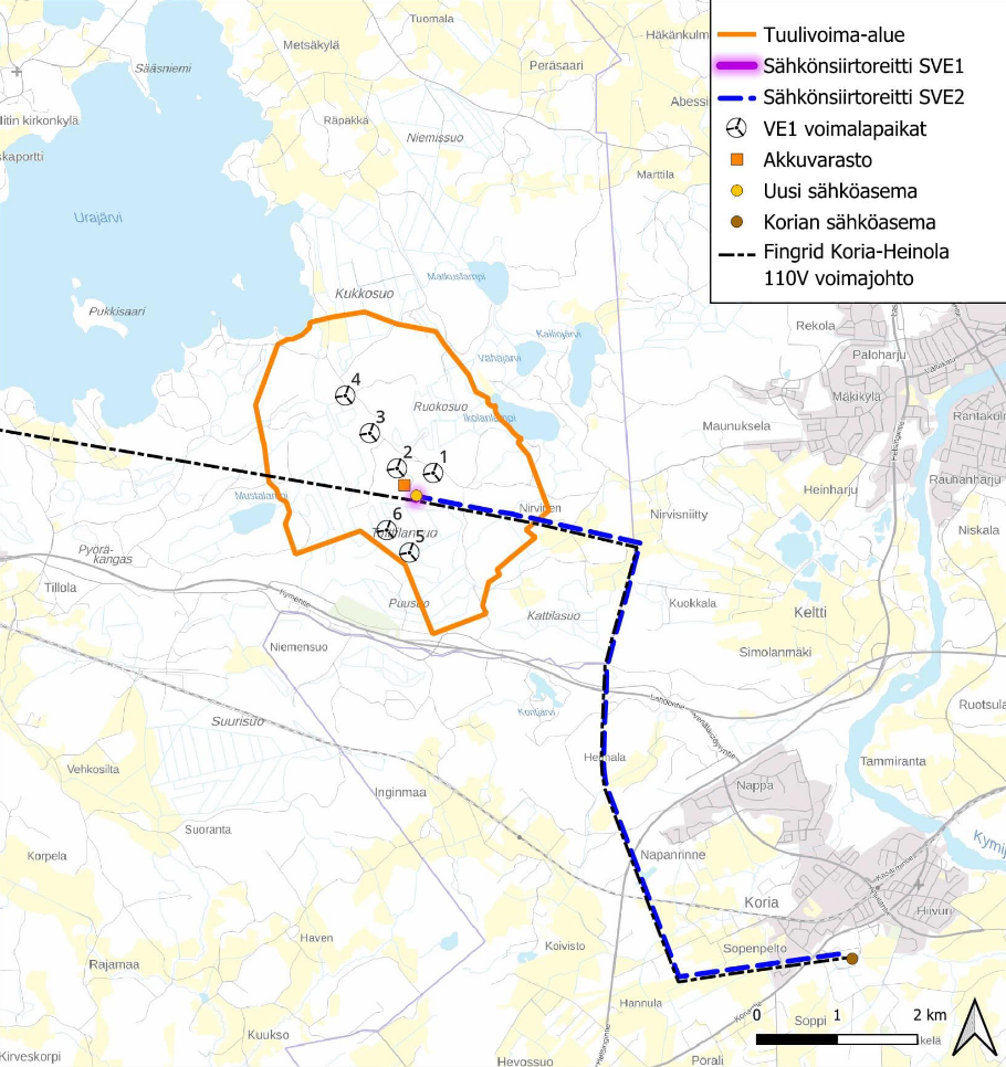 Karttakuva tuulivoima-alueen ja sähkönsiirtoreittien sijainnista.