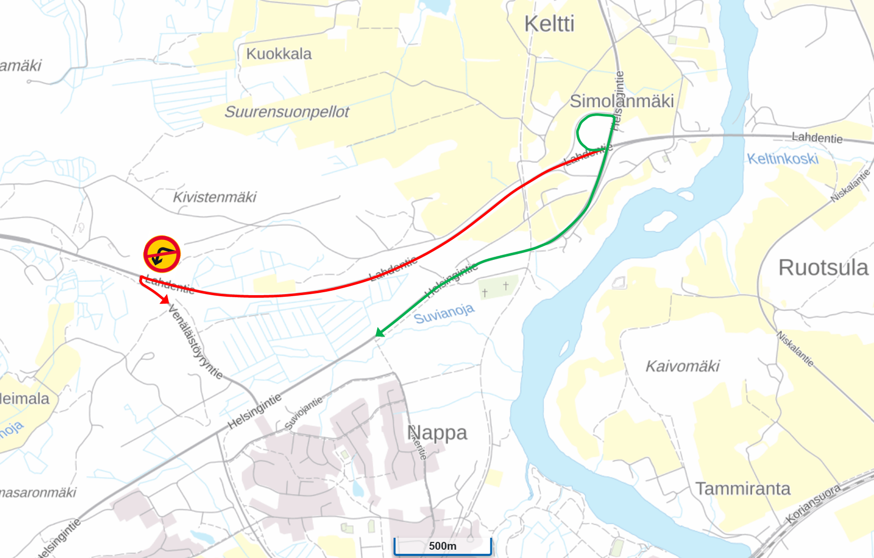 Muutos tulossa heinäkuun lopussa: Kääntyminen valtatieltä 12 vasemmalle Venäläistöyryntielle Kouvolan suunnasta kielletään