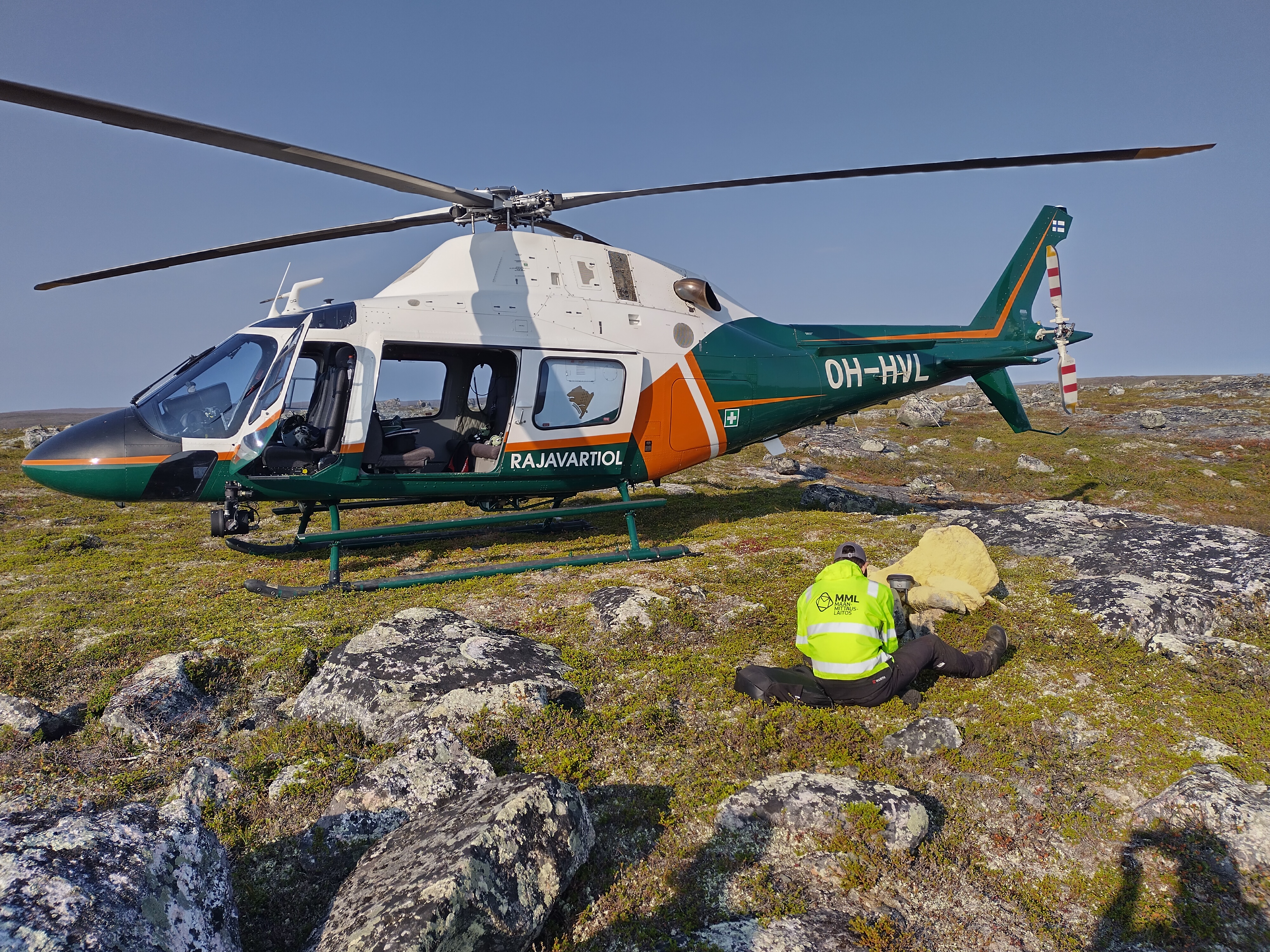 Rajavartiolaitos huolehtii rajankäynnin aikaisista kuljetuksista. Osa rajapyykeistä on alueilla, joille ei pääse kuin helikopterikyydillä. Kuva: Maanmittauslatos