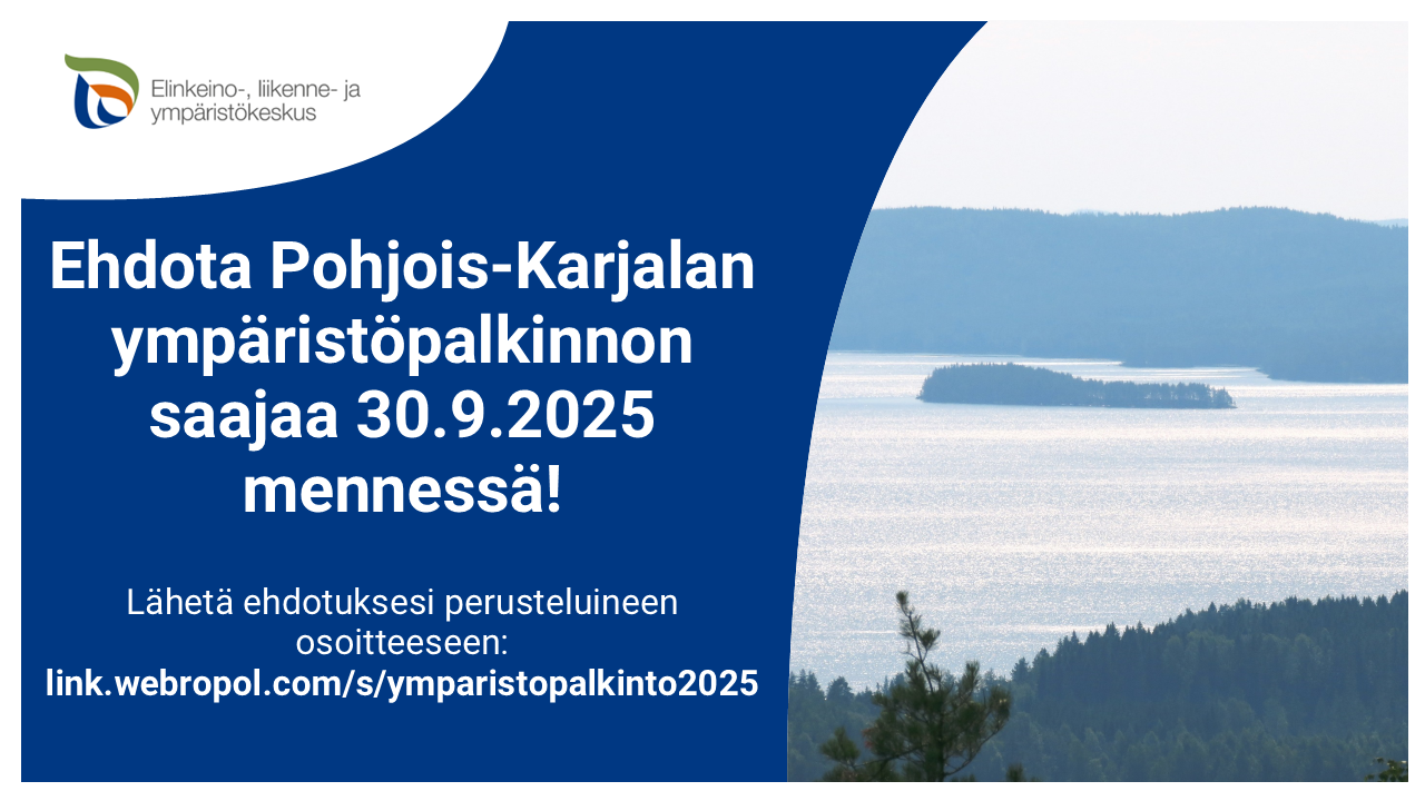 Pohjois-Karjalan ELY-keskus palkitsee vuosittain Pohjois-Karjalan luonnon ja ympäristön hyväksi toimineen henkilön, yhteisön, yrityksen ja/tai biosfäärialuetoimijan tunnustuksena ansiokkaasta työstä ympäristöasioiden edistämiseksi. Ehdotuksia ympäristöpalkinnon vastaanottajista otetaan vastaan 30.9.2025 asti.