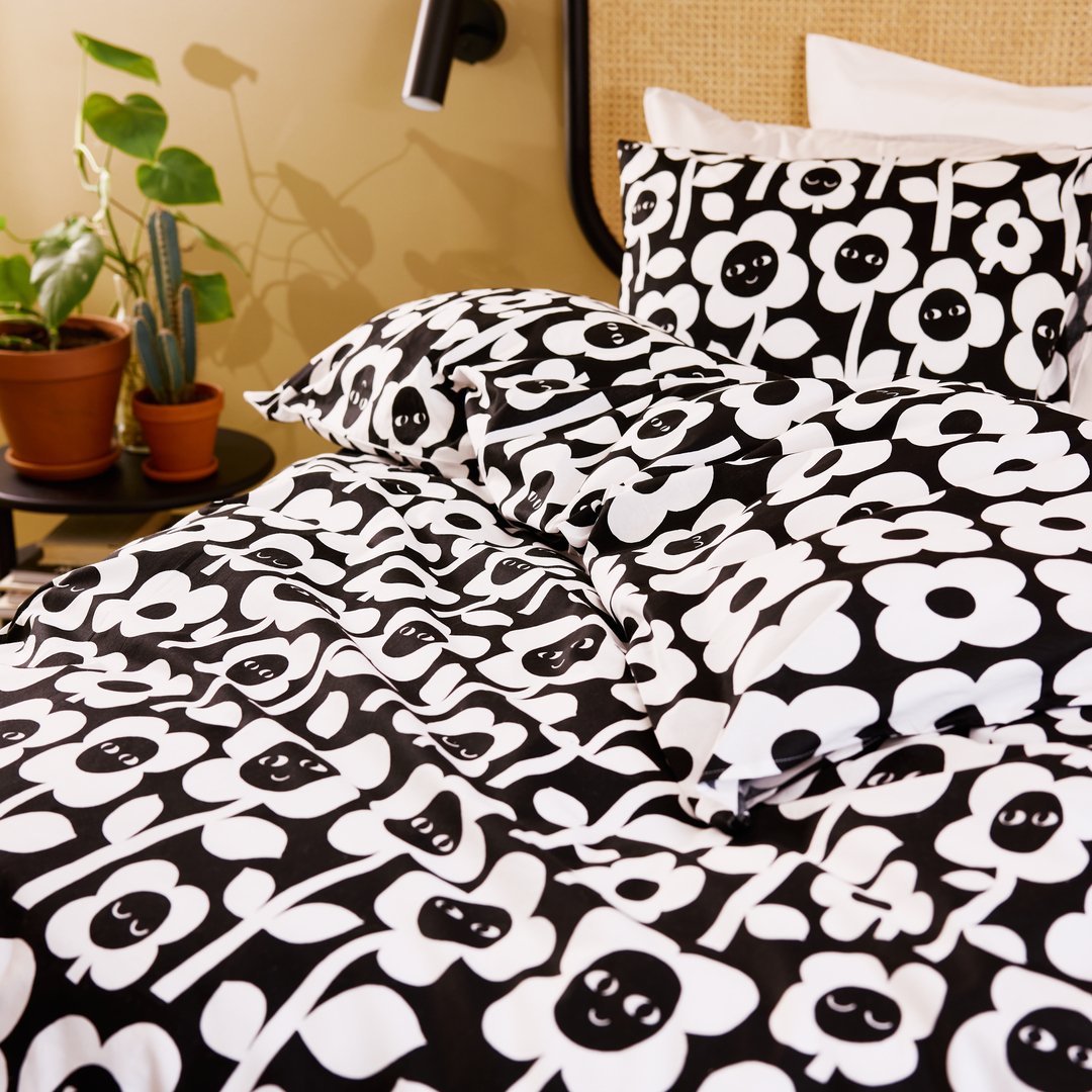kukkaloiston arkeen. Saatavilla on pussilakana, käsipyyhkeitä, toilettilaukkuja ja myös lasten oma pussilakanasetti. Materiaalina käytetty puuvilla on 100 % luomupuuvillaa, ja tuotteet on valmistettu korkealaatuisesta puuvillapalttinasta.