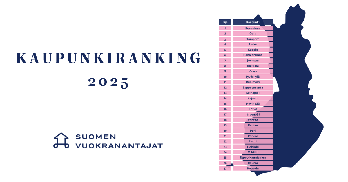 ”Asuntomarkkinoiden kolme vuotta jatkunut alamäki, ja vuokramarkkinoiden haasteet tietyissä kaupungeissa näkyvät rankingissa yhä selvemmin. Perinteisesti suurten kaupunkien vahvuus on ollut erityisesti nousevat markkinahinnat, mutta nyt etumatka on kaventunut. Tampere, Turku ja Oulu erottuvat silti edukseen vuokrakehityksessä, markkinointiajoissa ja tulevaisuuden näkymissä. Uusi ykkönen Rovaniemi on puolestaan tasaisen vahva suorittaja jokaisella osa-alueella, ja lisäksi siellä hintojen lasku on ollut selvästi maltillisempaa kuin suurissa kaupungeissa”, tiivistää Suomen Vuokranantajien ekonomisti Eemeli Karlsson.