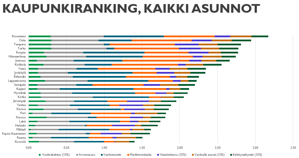 Listan viimeisenä jatkaa Kouvola, jonka kehitysnäkymät ja väestökehitys ovat heikoimmat koko vertailussa. Rauma pitää perää erityisesti arvonkehityksessä. Espoo puolestaan on kolmanneksi viimeinen ja löytyy viiden heikoimman joukosta monella osa-alueella: vuokrakehityksessä, tuotossa, markkinointiajoissa ja vuokralla asuvien osuudessa.