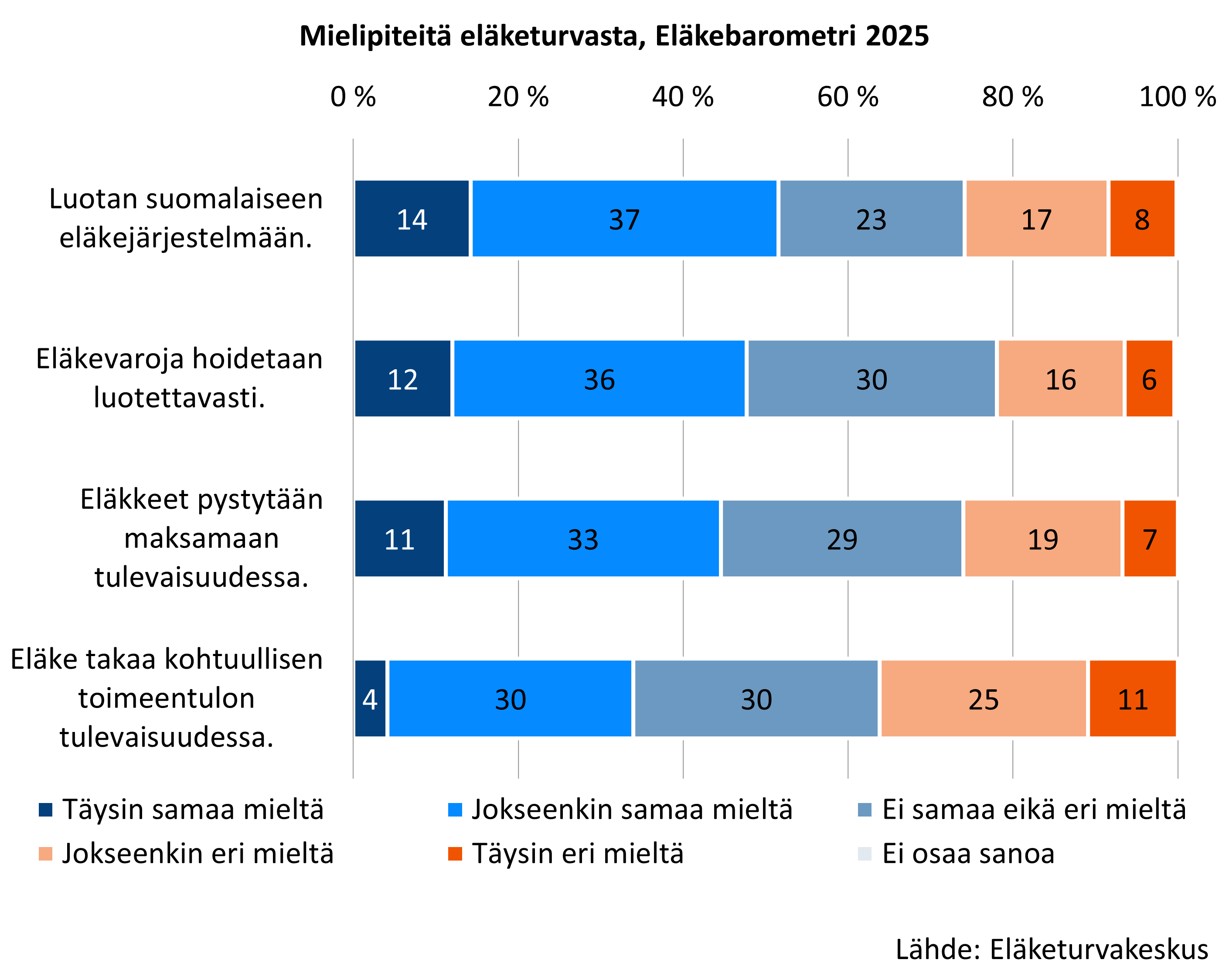 Noin puolet vastaajista kertoi luottavansa eläkejärjestelmään. Lähes puolet oli sitä mieltä, että eläkevaroja hoidetaan luotettavasti. Nuorilla alle 30-vuotiailla luottamus eläkejärjestelmään oli vähäisempää, kun taas yli 60-vuotiailla yleisempää.