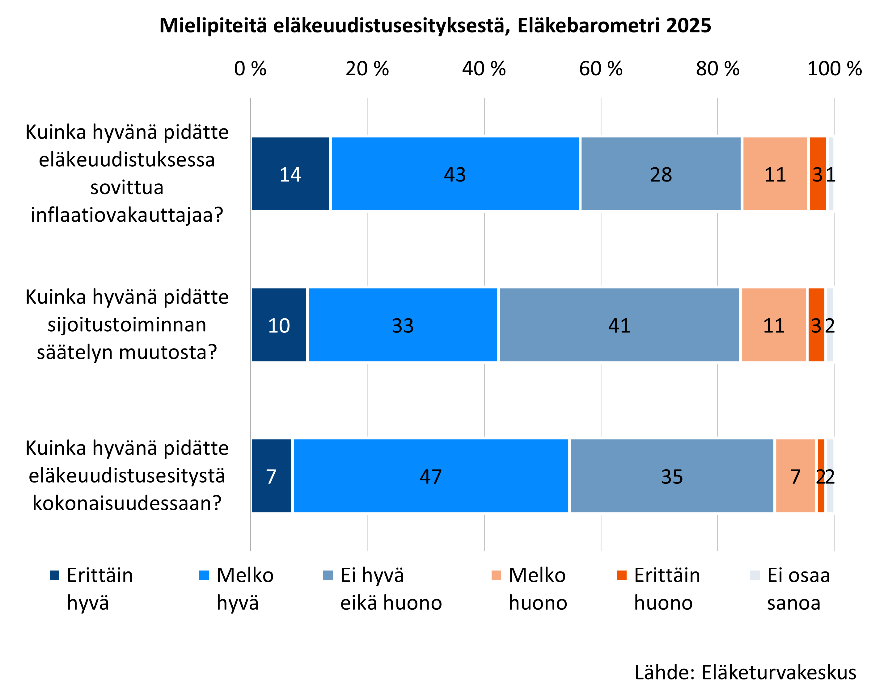 Suomalaisista noin 55 prosenttia pitää tammikuussa sovittua eläkeuudistusesitystä vähintään melko hyvänä. Eläkebarometrin mukaan noin puolet suomalaisista luottaa eläkejärjestelmään – luottamus on laskenut edellisiin kyselyihin verrattuna. Barometrin vastauksista heijastuu yleinen epävarmuuden lisääntyminen.