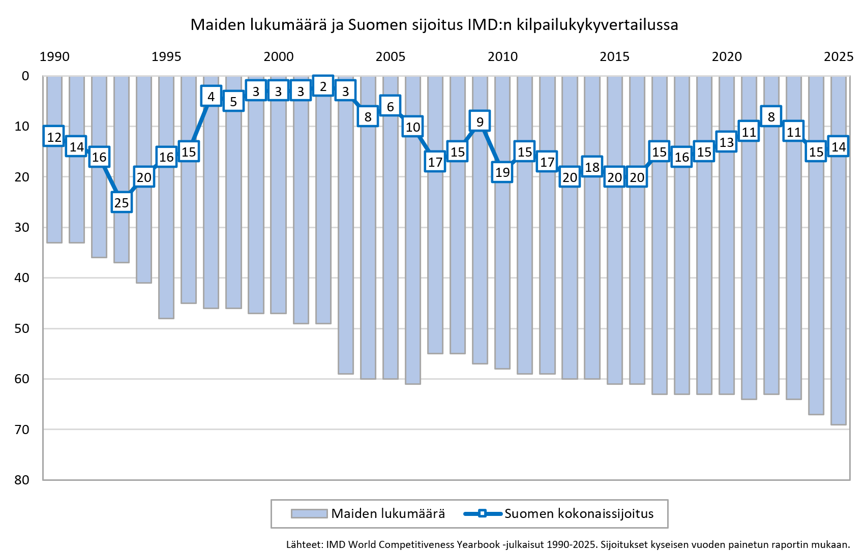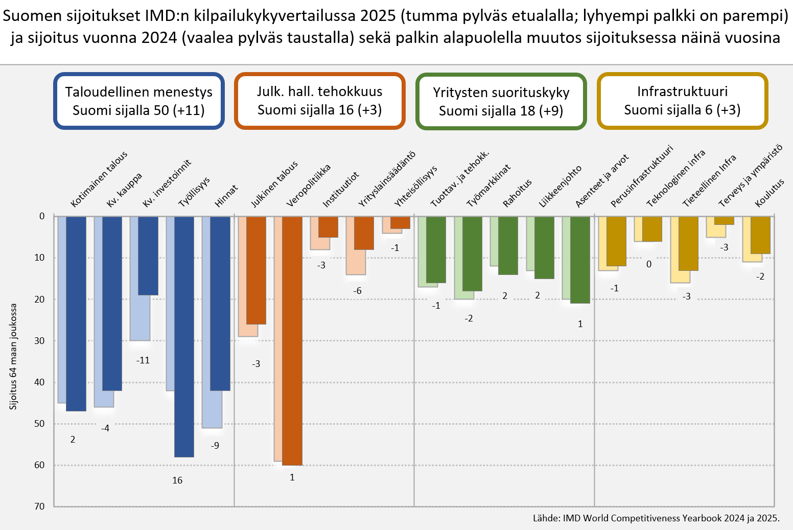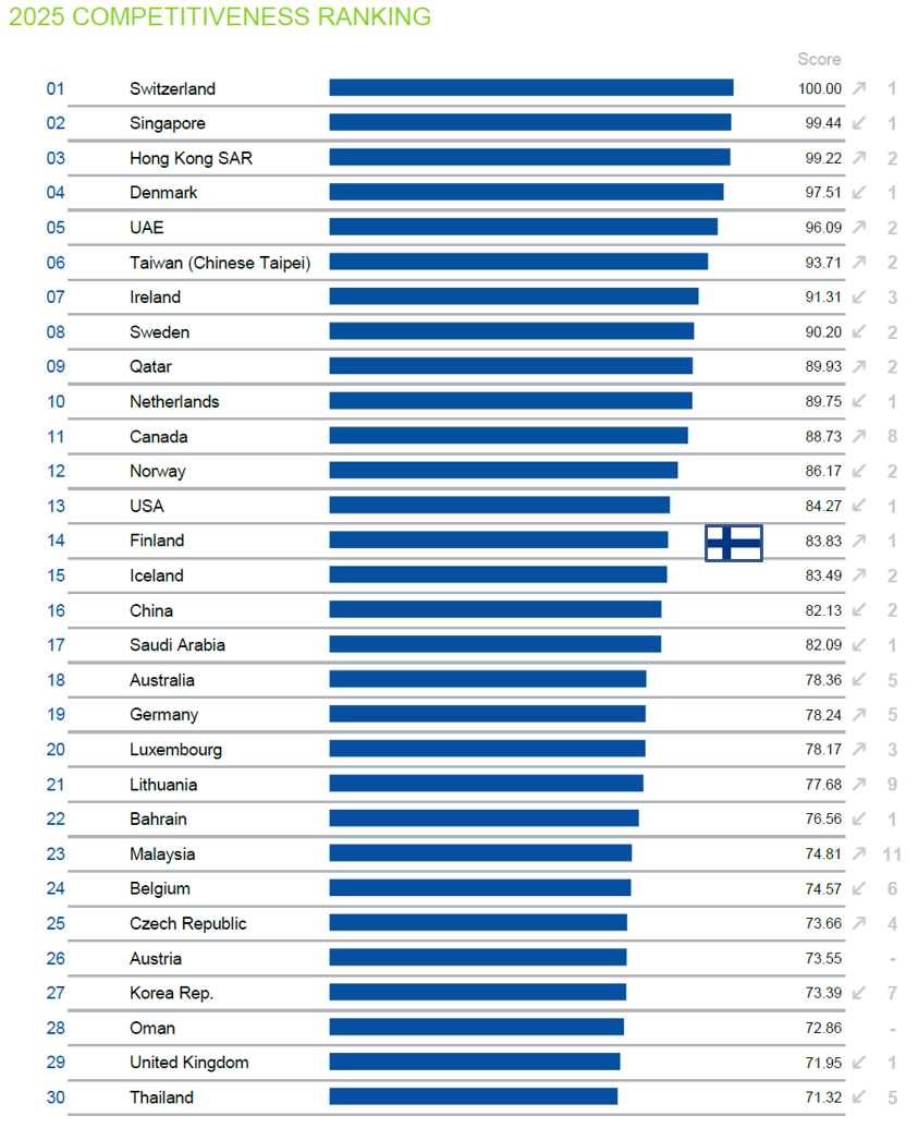 Suomi on parantanut tänä vuonna yhden pykälän verran sijoitustaan kilpailukykyä mittaavassa 69 maan kansainvälisessä vertailussa. Sveitsiläisen IMD:n (Institute for Management Development) kilpailukykyvertailussa Suomen sijoitus oli tänä vuonna 14., kun viime vuonna olimme sijalla 15. Suomen sijoitus vertailussa on nyt palautunut koronapandemiaa edeltävälle tasolleen, kun vuosina 2021–2023 Suomi oli jo kivunnut sijoille 8–11.