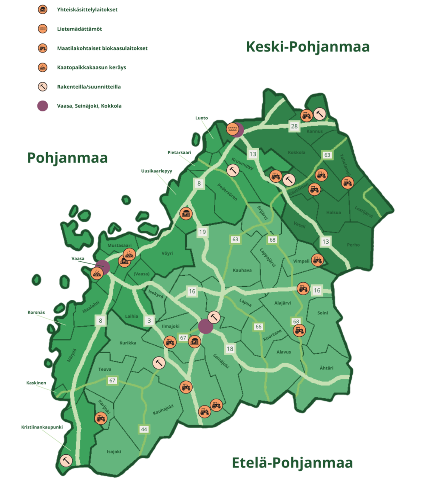 Alueelle on suunnitteilla tai rakenteilla kuusi uutta laitosta, mutta tuotantopotentiaali ei rajoitu kuntien tai maakuntien rajoihin. Keskeistä on syötteiden sijainti suhteessa laitoksiin. Biokaasutuotannon kasvattaminen edellyttää investointeja, logistiikan kehittämistä ja maakuntien välistä yhteistyötä.
