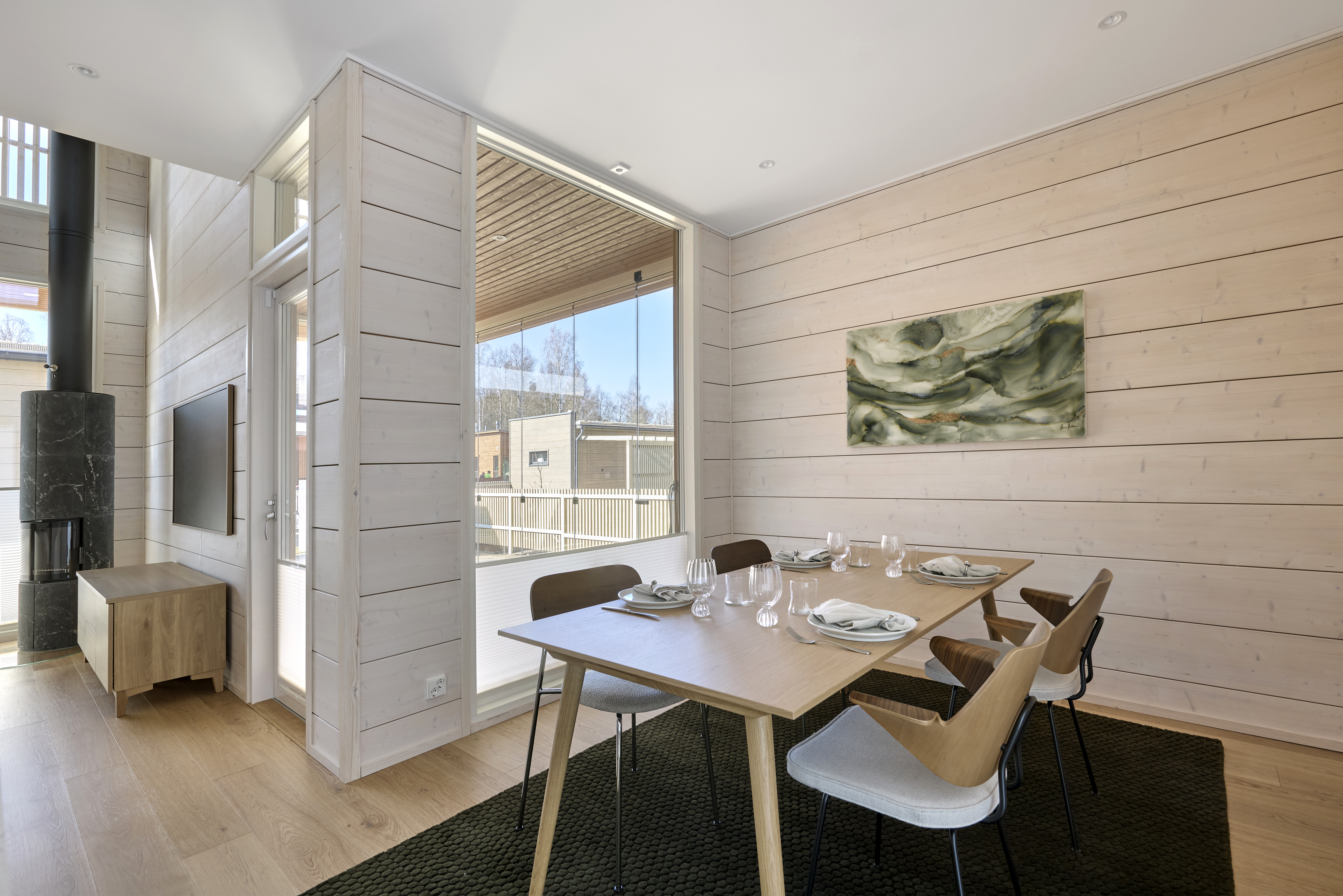 – Asiakkaat haluavat nykyään puupintoja osaksi sisustusta, mutta modernilla tavalla. Hirsi ei myöskään rajoita rakennusteknisiä ratkaisuja takavuosien tapaan, vaan esimerkiksi suuret lasipinnat ovat moderneissa hirsitaloissa mahdollisia”, kertoo DENin arkkitehtisuunnittelija Emma Ukkola.