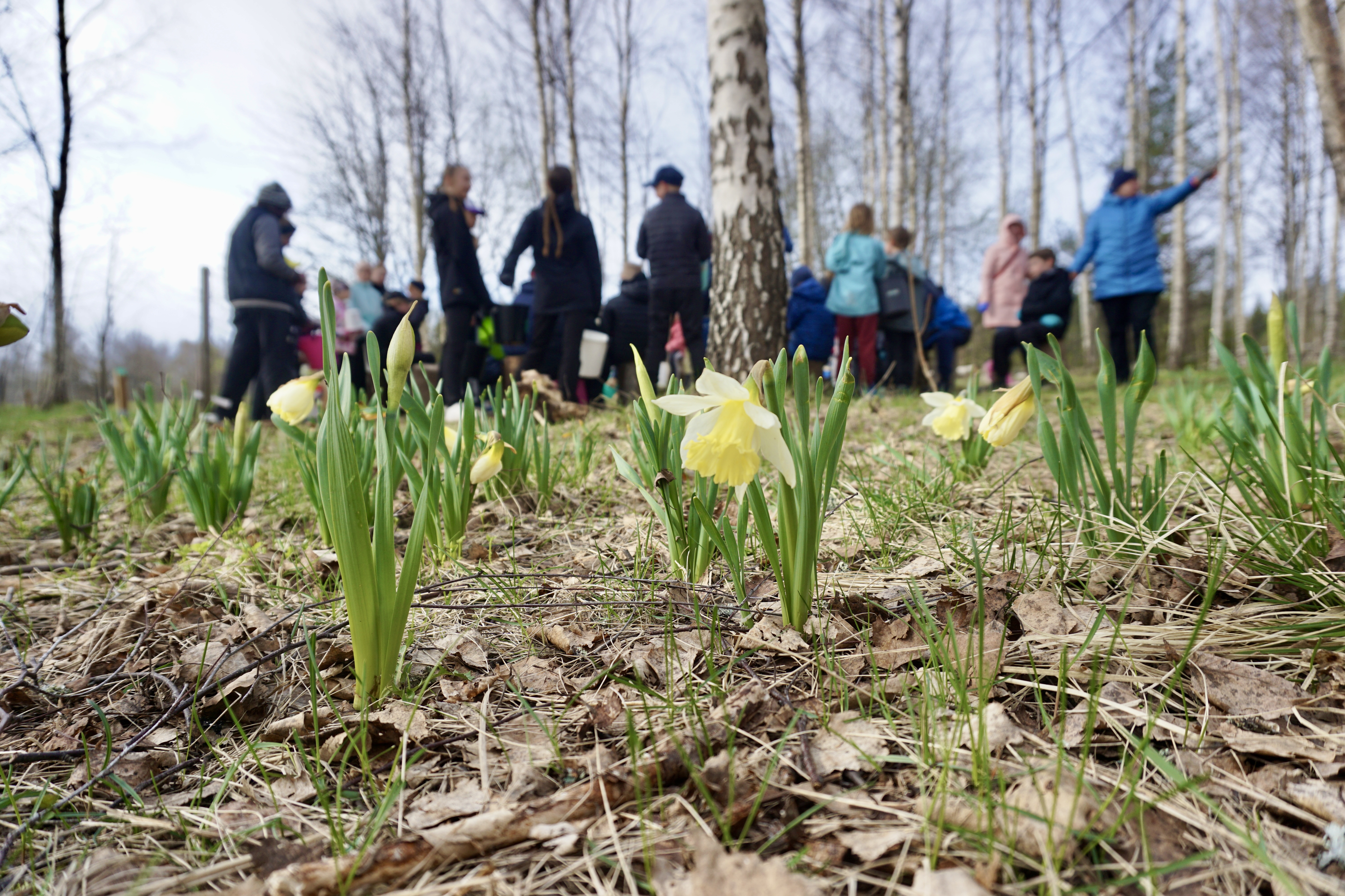 Det är liv och rörelse vid Laajakallion koulu i Bredberget i Kyrkslätt. Den här aprilmorgonen skiner solen och fåglarna kvittrar medan talkogänget jobbar i skolans egna arboretum – en slags park för träd- och växtarter. Mellan träden skymtar flitiga elever med färggranna ämbaren i högsta hugg.