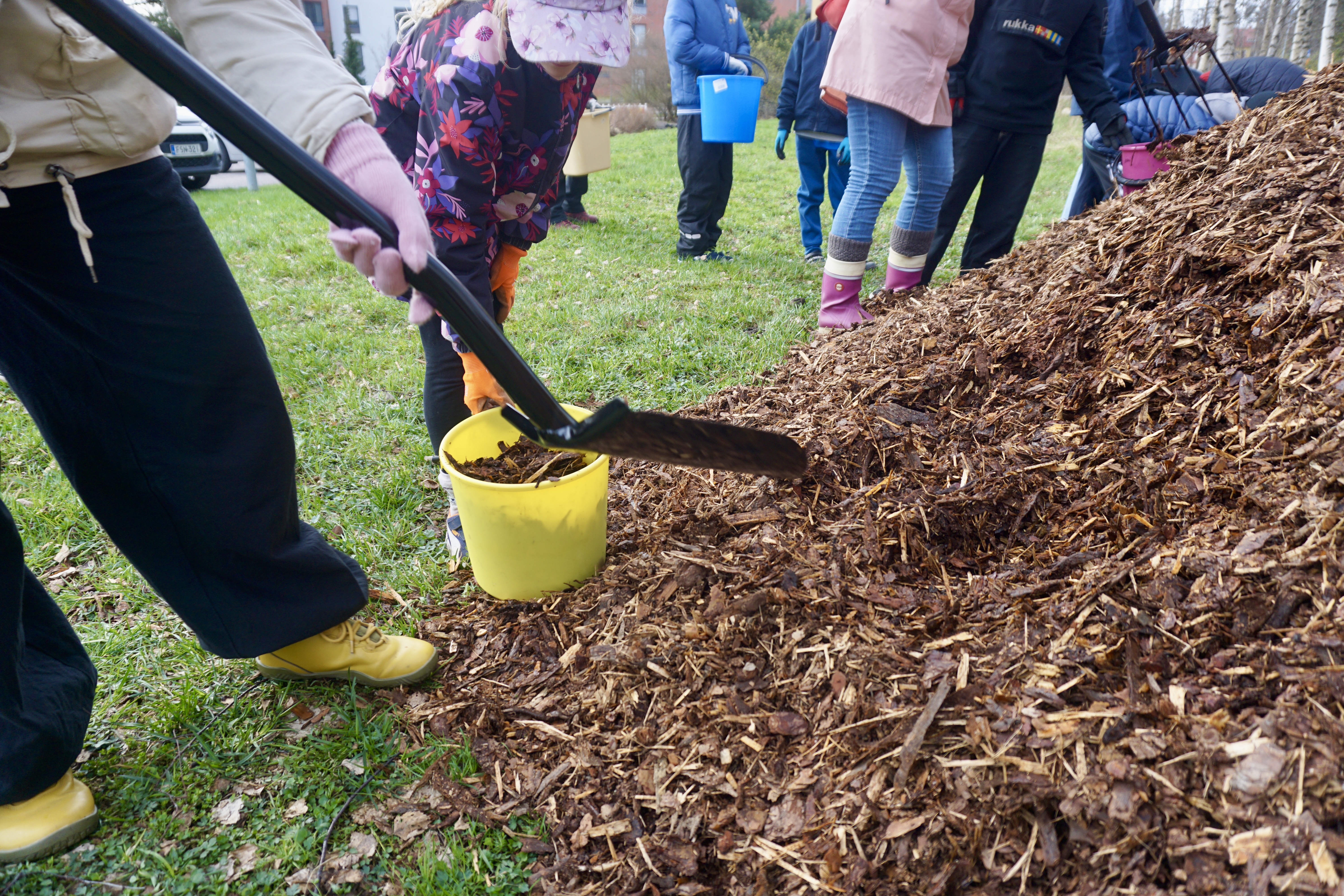 Från en stor hög lastas barkflis in i de väntande elevernas hinkar, och de skyndar raskt iväg för att sprida ut det på arboretumets stigar. Grenar och kvistar samlas ihop och läggs i stora högar på olika håll av parken. Rishögar, kanske någon tänker. Insekthotell, tänker man här.