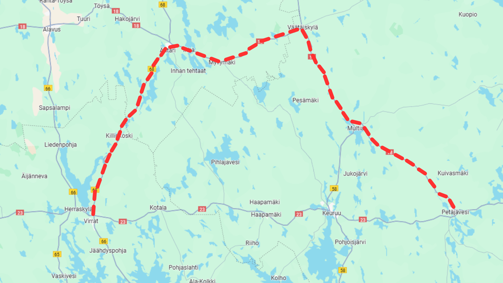 Raskaan liikenteen kiertoreitti kulkee virallisella varareitillä Virrat-Ähtäri-Multia-Petäjävesi. Raskaan liikenteen kiertotie pidentää matkaa noin 40 kilometriä.
