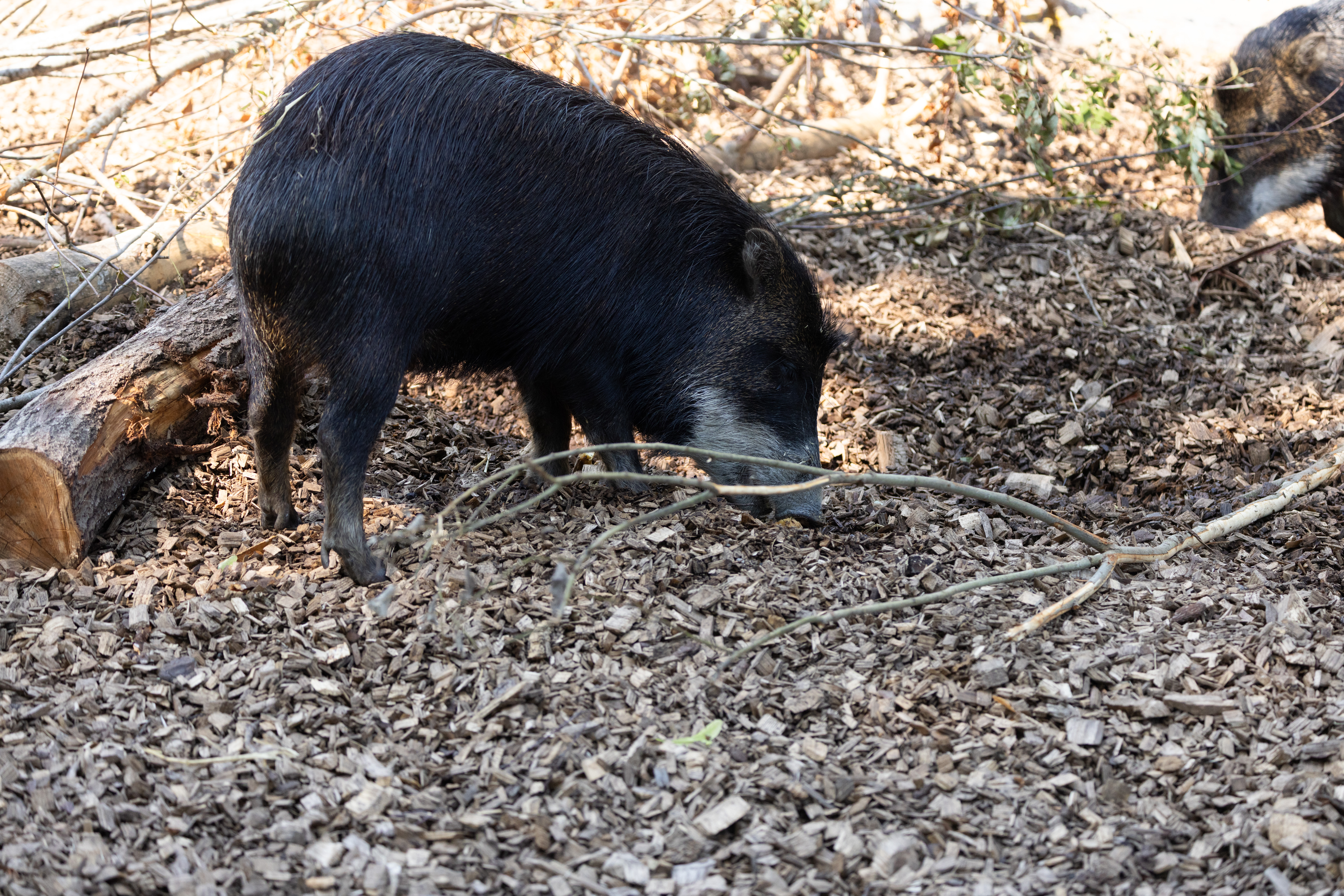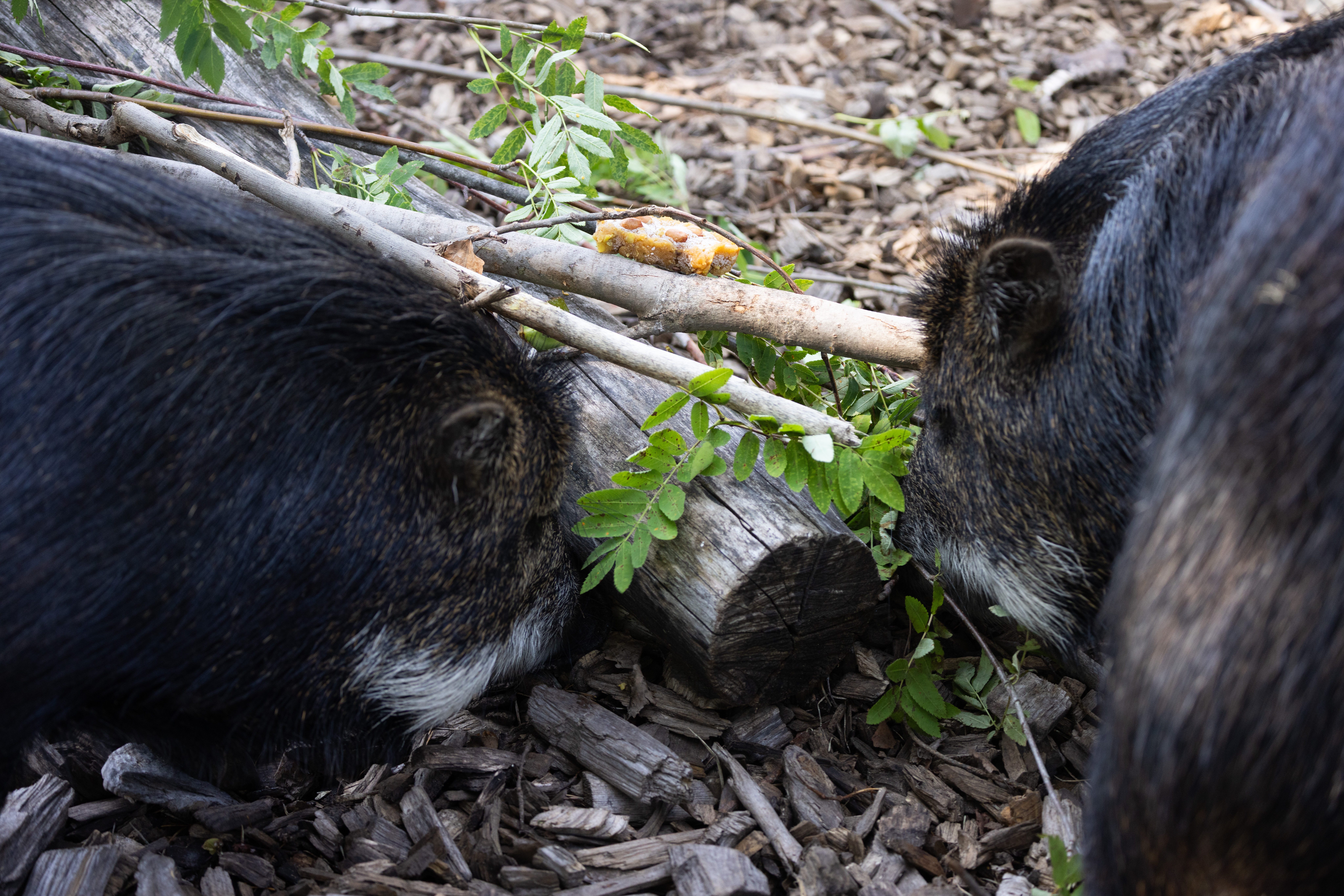 Huulipekarit pääsivät ensimmäisenä maistamaan helleherkkujaan. Possun muotoisella piparimuotilla tehdyissä annoksissa oli omenan lisäksi maapähkinää. Oksien päälle sijoitettujen herkkujen löytämisessä kesti hetken aikaa, mutta pian jäädykkeet katosivat yhdellä hotkaisulla pekarien suihin.