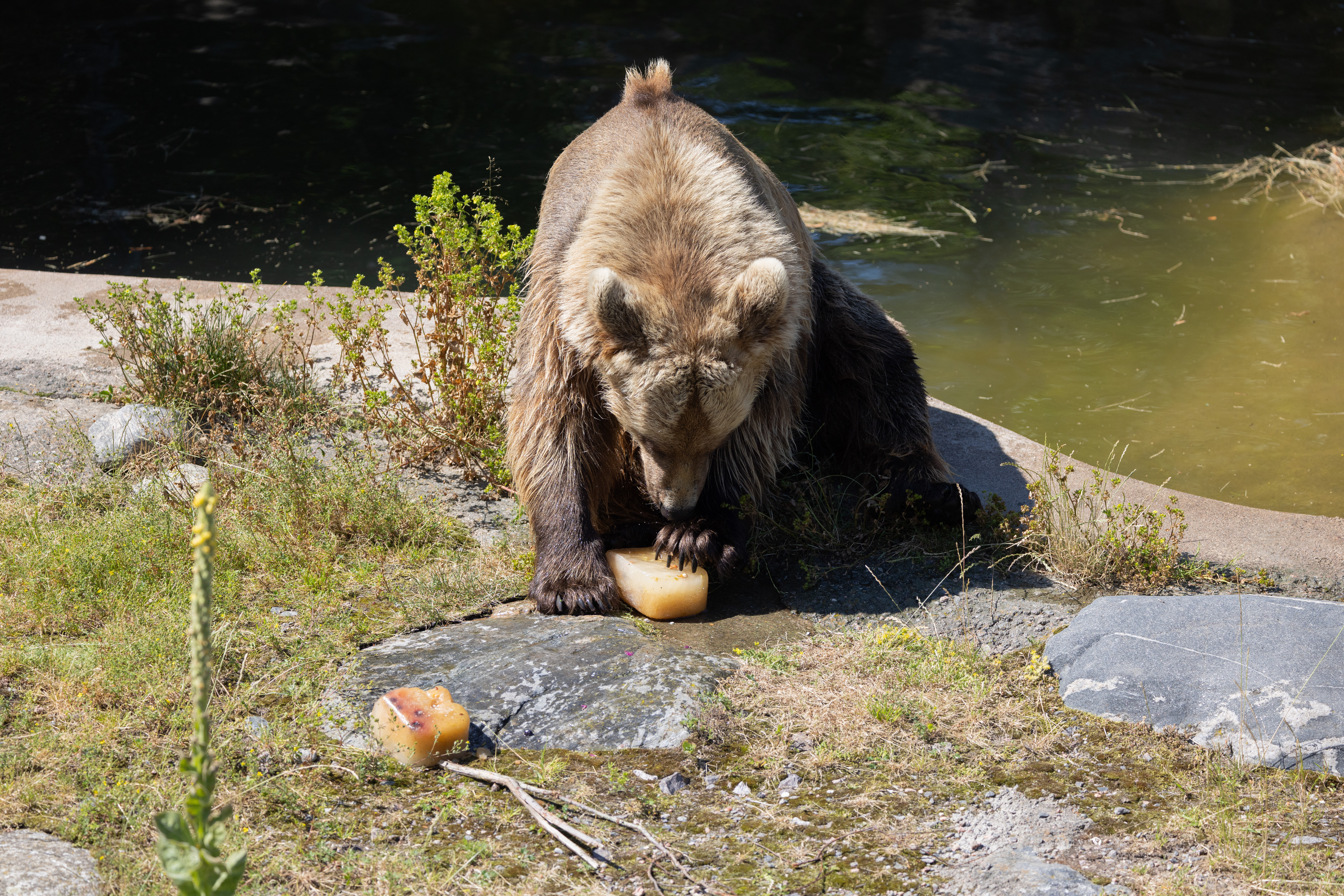 Myös karhut kävivät heti ulkotarhaan päästyään tottuneesti herkkujensa kimppuun. Niiden eväät koostuivat omenan lisäksi maapähkinästä, pensasmustikasta ja ruusun terälehdistä. Karhut käyttivät koko painoaan jäisen herkun halkaisemiseksi, ja raapivat sen pinnasta mustikoita irti kynsillään.