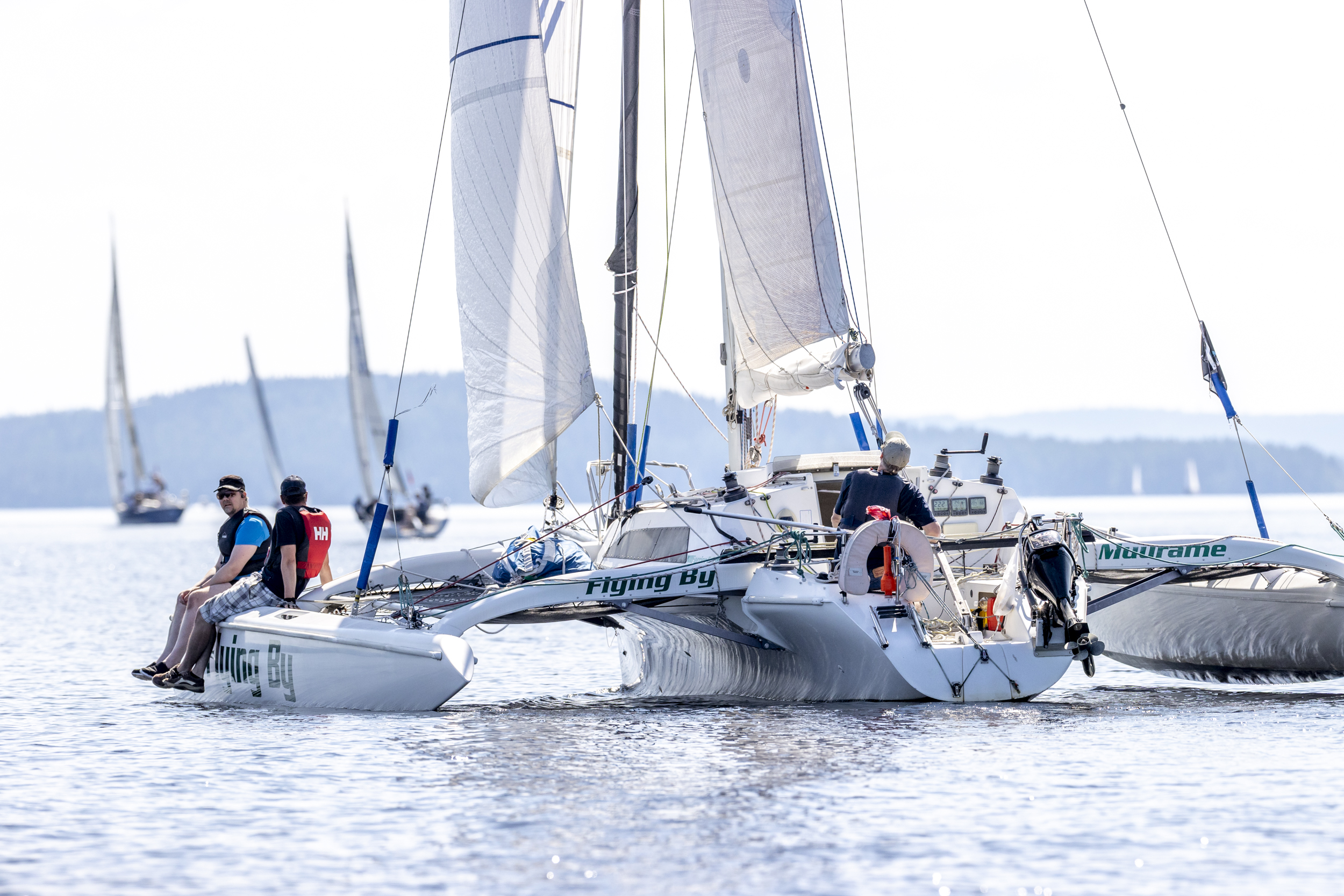 Vuoden 2024 kilpailun voittanut Jyväskylän Veneseuran Jari Vanhalan kolmirunkovene ”Flying By” ei ollut lauantain kevyissä tuulissa parhaimmillaan ja oli vielä iltakuuden jälkeen lähestymässä ensimmäistä väliaikapistettä.