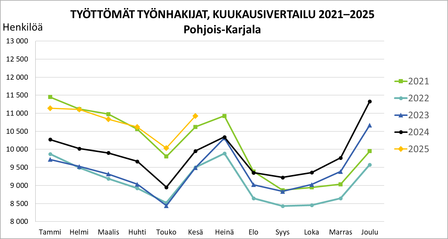Pohjois-Karjalassa oli kesäkuun lopussa 10 925 työtöntä työnhakijaa, joista 553 oli lomautettuna. Vuoden takaiseen verrattuna työttömiä oli 967 henkilöä enemmän (10 %) ja lomautukset vähentyivät 49 henkilöllä ( 8 %).