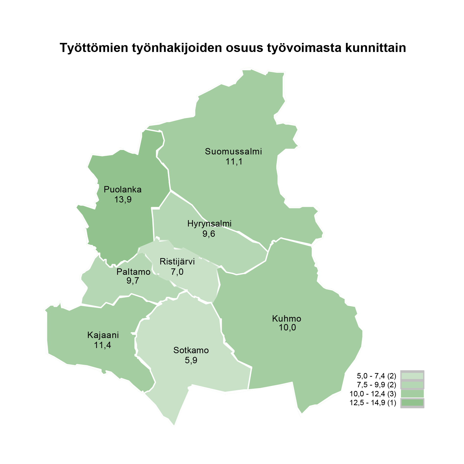 Kainuun kunnissa työttömyys pieneni viime vuodesta viidessä kunnassa ja nousi kolmessa. Lasku oli suhteellisesti suurinta Ristijärvellä (-18 %) ja Hyrynsalmella (-14 %), kasvua tuli eniten Kajaanissa (+13 %) ja Kuhmossa (+5 %). Työttömien työnhakijoiden osuus työvoimasta oli peräti seitsemässä Kainuun kunnassa matalampi kuin koko maan keskiarvo. Alhaisin työttömyysaste oli Sotkamon 5,9 % ja Ristijärven 7,0 %. Korkein työttömyysaste oli Puolangan 13,9 % ja Kajaanin 11,4 %.