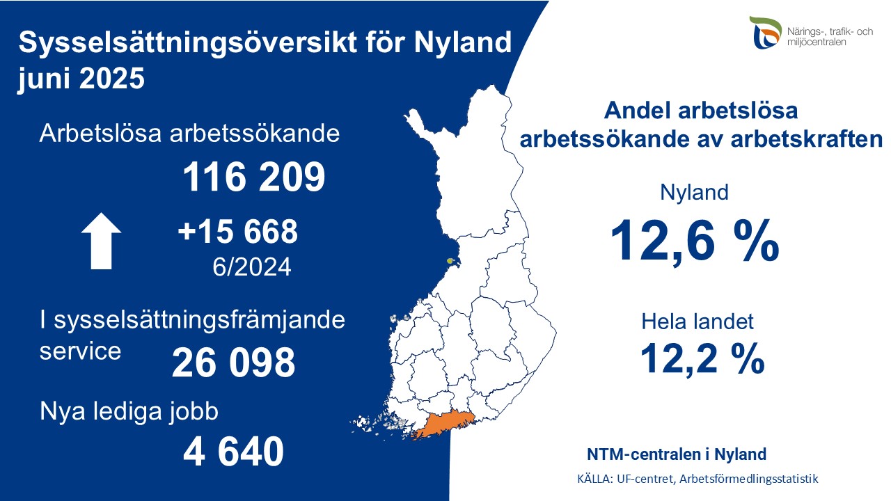 Sysselsättningsöversikten över Nyland för juni har publicerats. Enligt översikten var mängden arbetslösa arbetssökande 15,6 % större i Nyland än året innan. I slutet av juni fanns det i området 116 209 arbetslösa arbetssökande, varav 5 219 var permitterade.