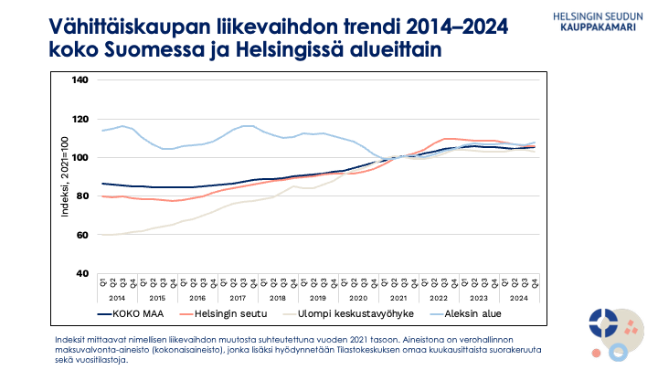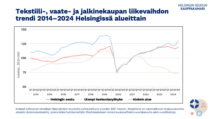 ”Vähittäiskaupan tilanne ydinkeskustassa jatkuu haastavana, mutta erityisesti muotikaupan eli tekstiili-, vaate- ja jalkinekaupan kehitys on viime vuosina ollut positiivista. Sen liikevaihto vastaa nyt suunnilleen koronavuoden 2020 alkua. Hyvälle kehitykselle on nähtävissä jatkoa, kun inflaatio on hellittänyt ja korot laskeneet, mutta kuluttajien varovaisuus ja työttömyys hidastavat sitä. Lisäksi aikansa ottavat keskusta-alueen poikkeuksellisen laajat ja pitkäkestoiset infrainvestoinnit heikentävät keskustan saavutettavuutta, ennen kuin näkyvät elinvoiman ja viihtyisyyden paranemisena. Tällä välin elinkeinoelämän ja Helsingin kaupungin etsittävä yhteisiä keinoja, joilla ydinkeskustan vireys saadaan pysymään nousukiidossa.”, sanoo Helsingin seudun kauppakamarin vaikuttamistyön johtaja Markku Lahtinen.