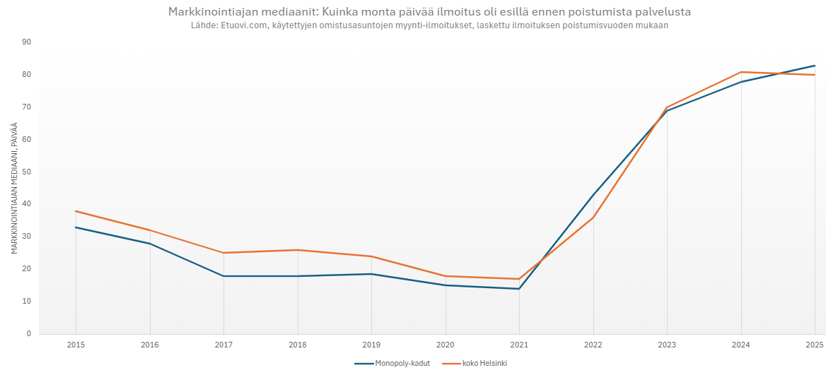 Markkinointiajalla tarkoitetaan sitä, kuinka monta päivää myynti-ilmoitus oli esillä Etuovi.comissa ennen poistumistaan. Monopoly-katujen markkinointiajan mediaani seurasi samoja trendejä kuin Helsingissä yleisesti: vuodesta 2022 lähtien ilmoitukset ovat pysyneet esillä aiempaa pidempään. Tällä hetkellä mediaani on lähes kolme kuukautta, mikä on selvästi enemmän kuin aiempina vuosina.