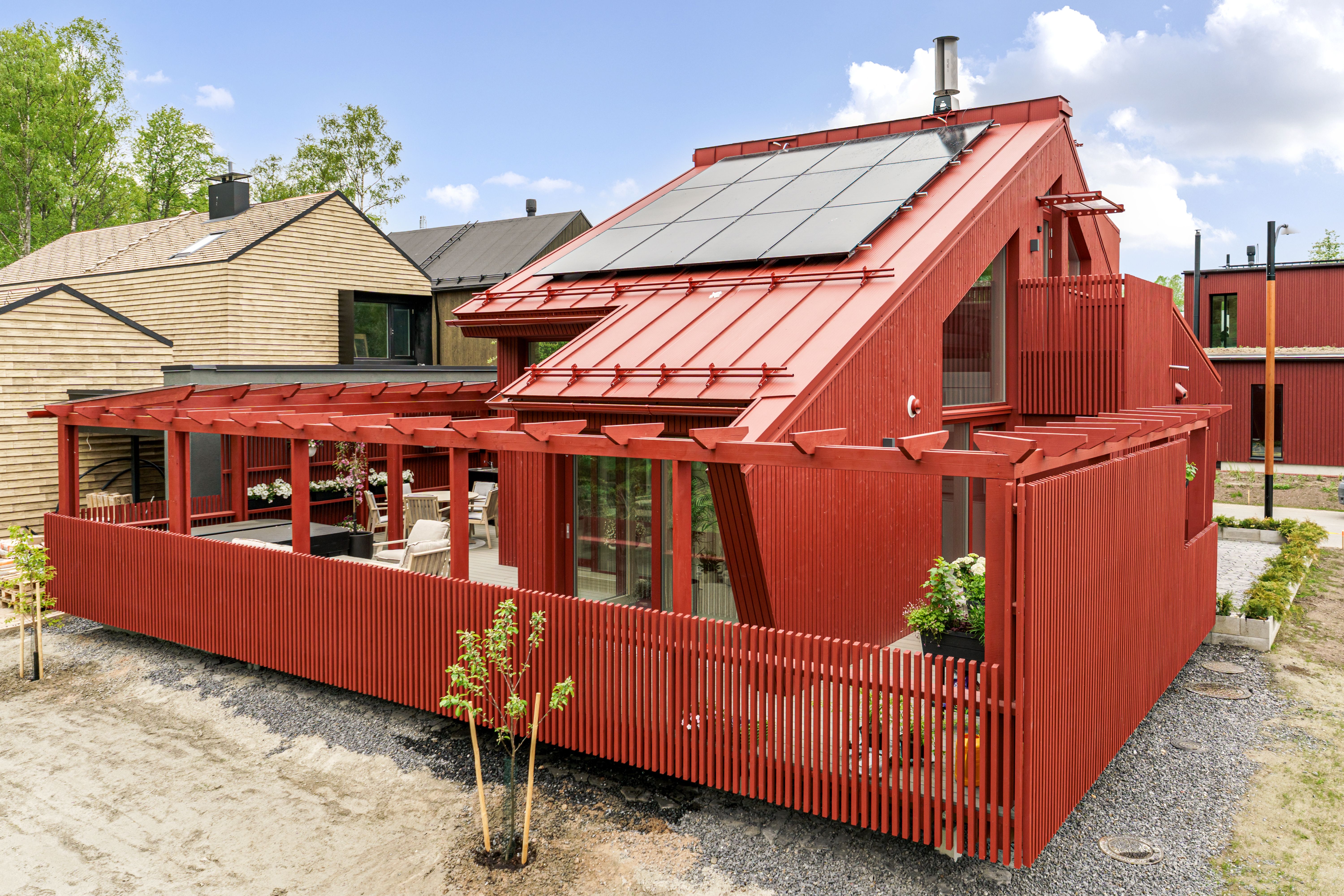 ”Tällä kertaa oli vaikeaa löytää kohdetta, jossa ei olisi ollut jonkinlaista rimoitusta. Ne ovat kyllä kieltämättä kauniita ja niitä oli käytetty oivaltavasti. Myös terasseihin on täällä panostettu poikkeuksellisen paljon – selvästikin suuntaus on se, että oleskelutiloja halutaan jatkaa pihoille saakka”, Seppo toteaa.