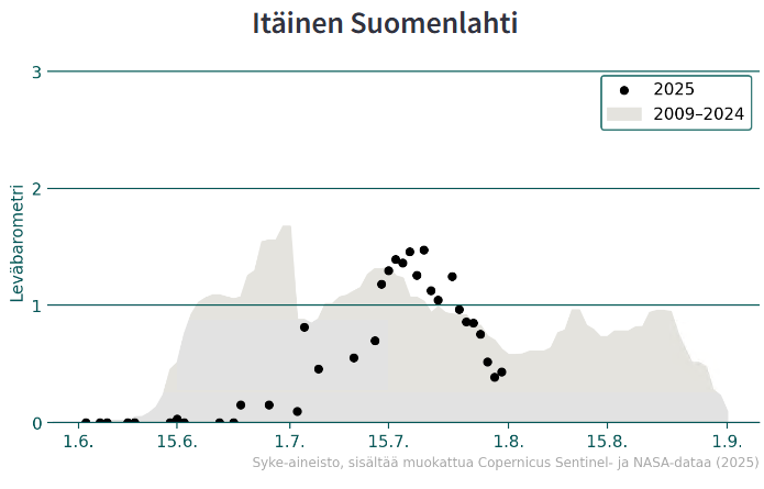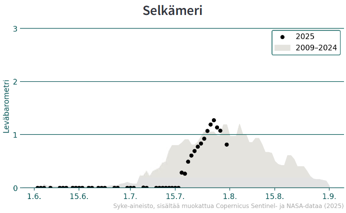 Avomerialueiden sinilevätilannetta voi seurata satelliittiaineistosta koostettujen leväbarometrien avulla. Barometrissa kuluvan vuoden havainnot on merkitty mustina pisteinä. Pidemmän aikavälin (vuosien 2009–2024) vaihteluväli näkyy vaalean harmaana (90 % satelliittihavainnoista).
