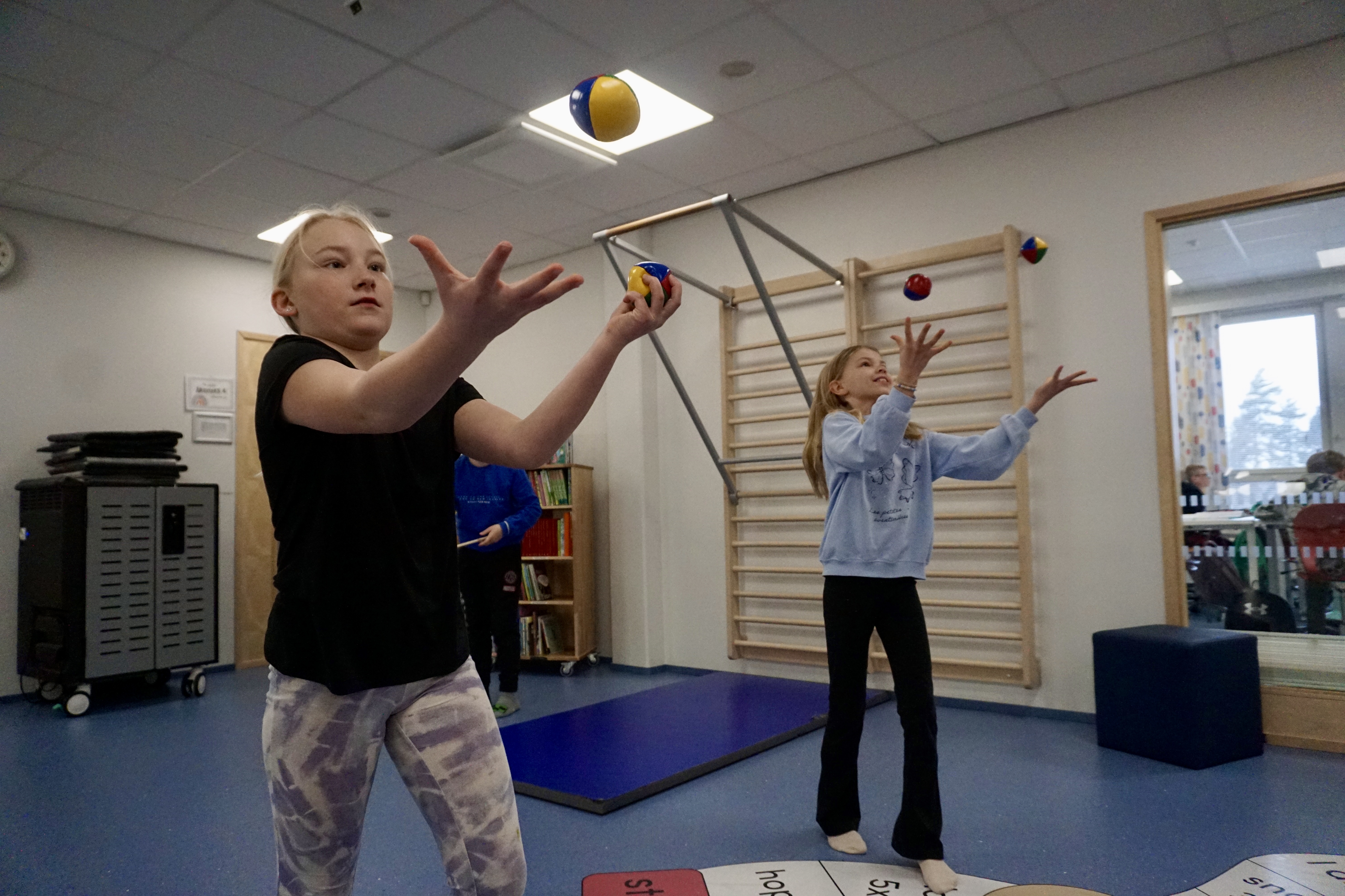 Uppe på övre våningen av skolan hittar vi tredjeklassarna Edit, Ina och Kevin som provar på lite jongleringsbollar, hopprep och andra cirkusredskap. Det går häpnadsväckande bra. Fast så visar det sig också att Ina går på Cirkusklubb och har hunnit öva en del.
