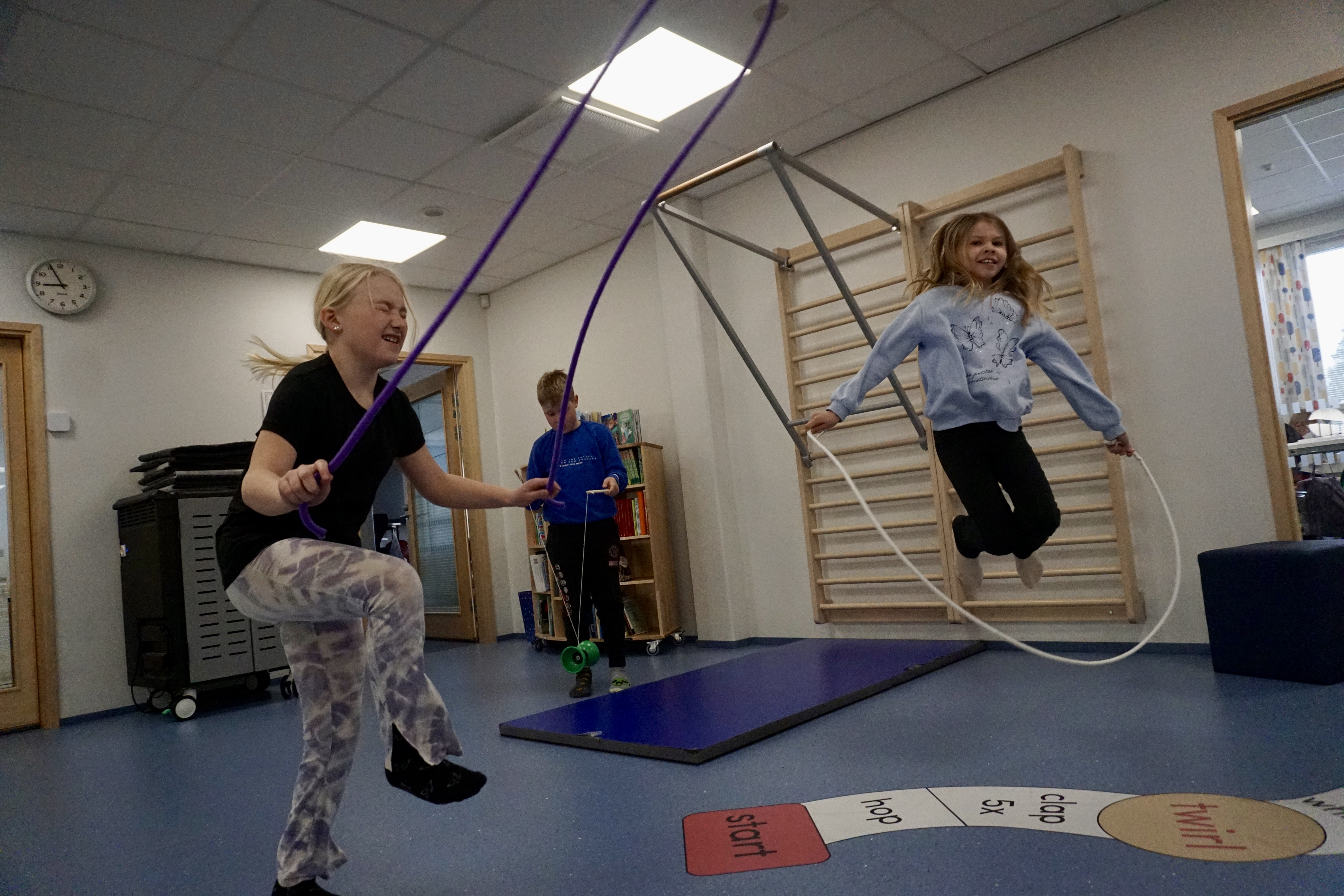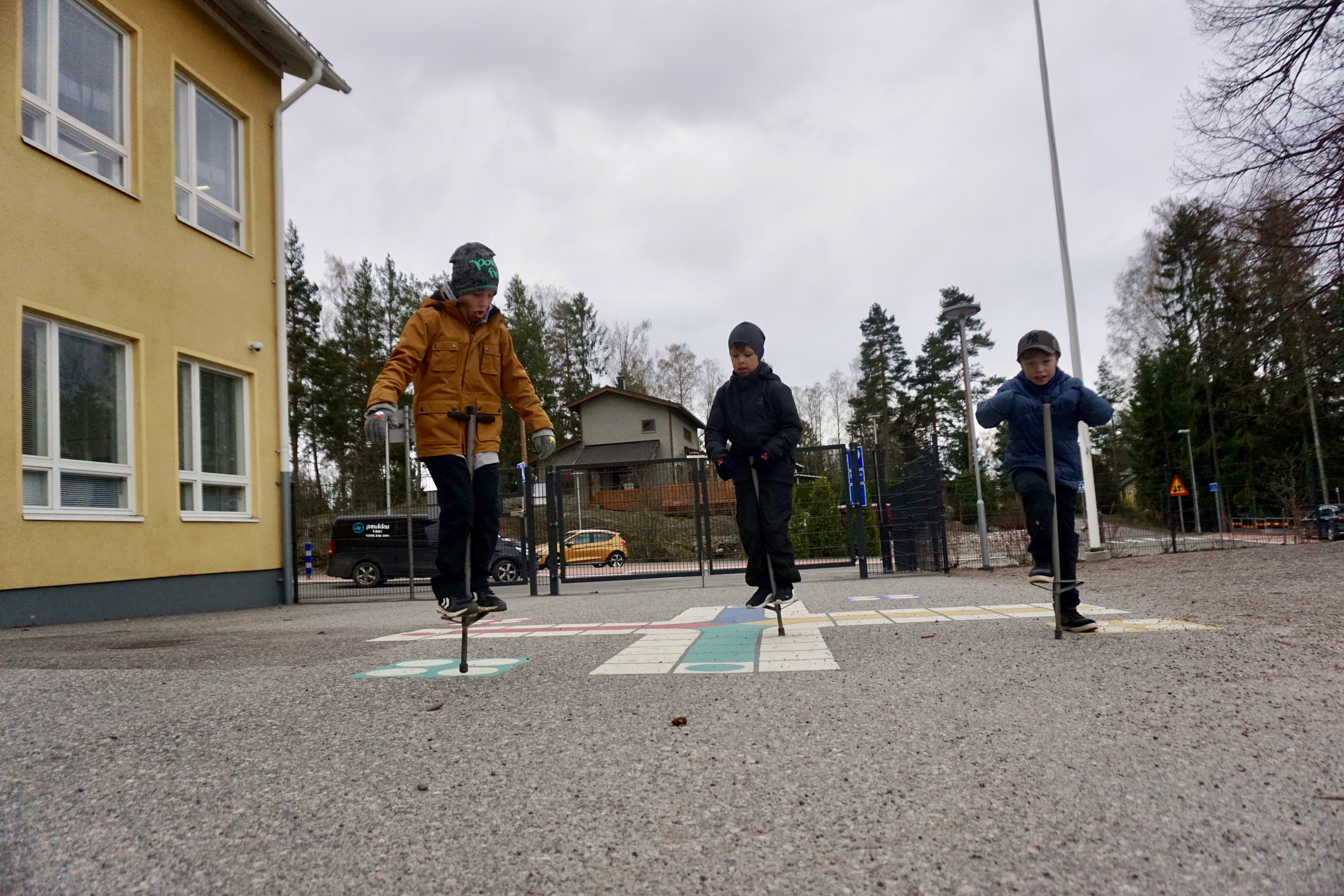 Framför allt hoppstyltorna har varit extremt populära. Både Hendy-Lång och kollegan Sandra Lönnfors säger att det oftast är kö för att få använda dem. Även den här måndagsmorgonen står det en stor klunga och ser på när förstaklassarna Riku, Marlon och Axel hoppar.