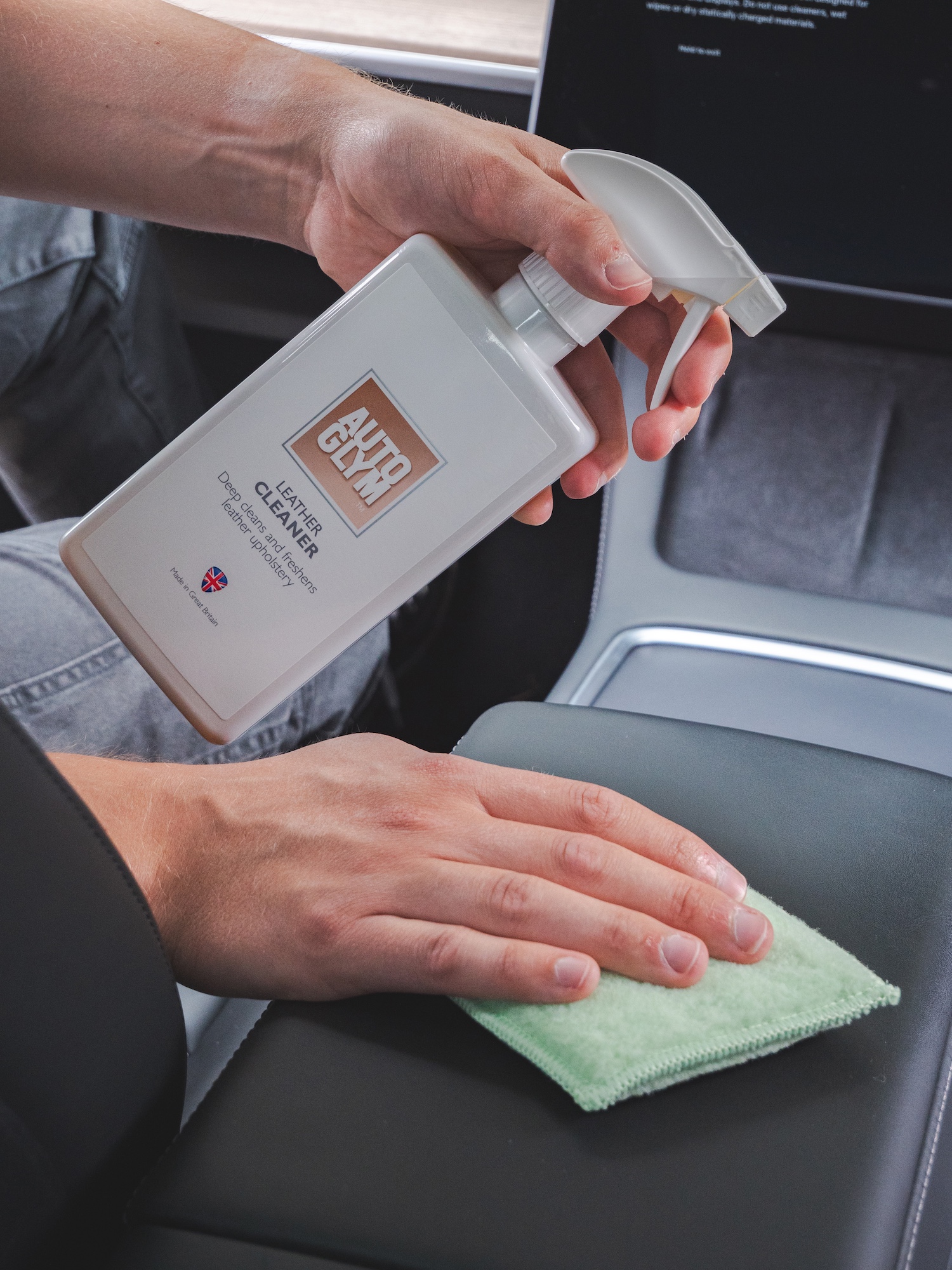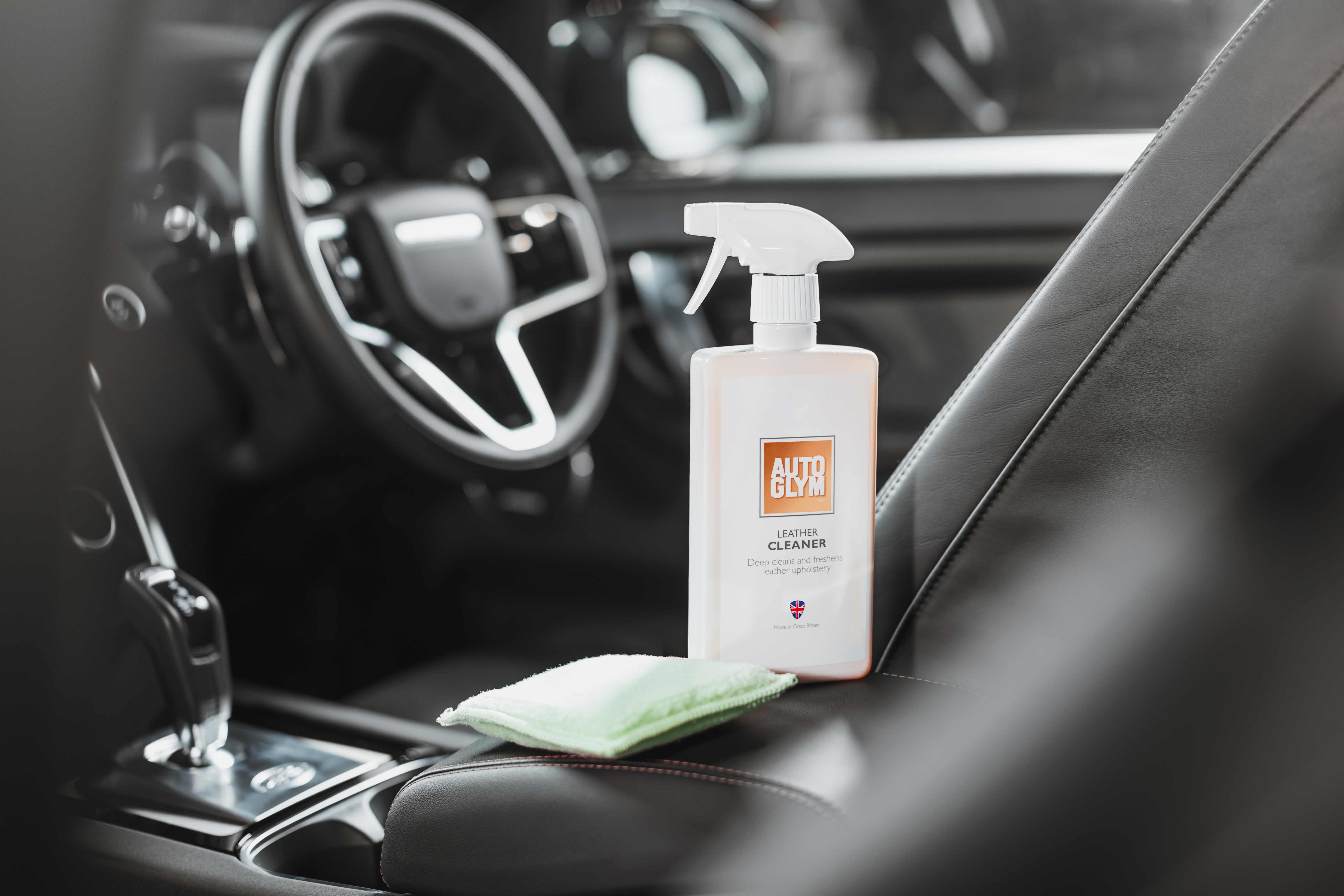 Myös nahkapinnat kaipaavat hoitoa erityisesti lämpimien kesäpäivien jälkeen. Hiki, aurinkovoide ja muut nesteet ja pöly kuivattavat pintaa. Nahkaiset auton osat voi puhdistaa Autoglym Leather Cleanerilla, joka poistaa tehokkaasti lian, mutta säilyttää nahan joustavuuden ja pehmeyden. Pinnat kannattaa pyyhkiä kostealla liinalla ennen puhdistusaineen levitystä.