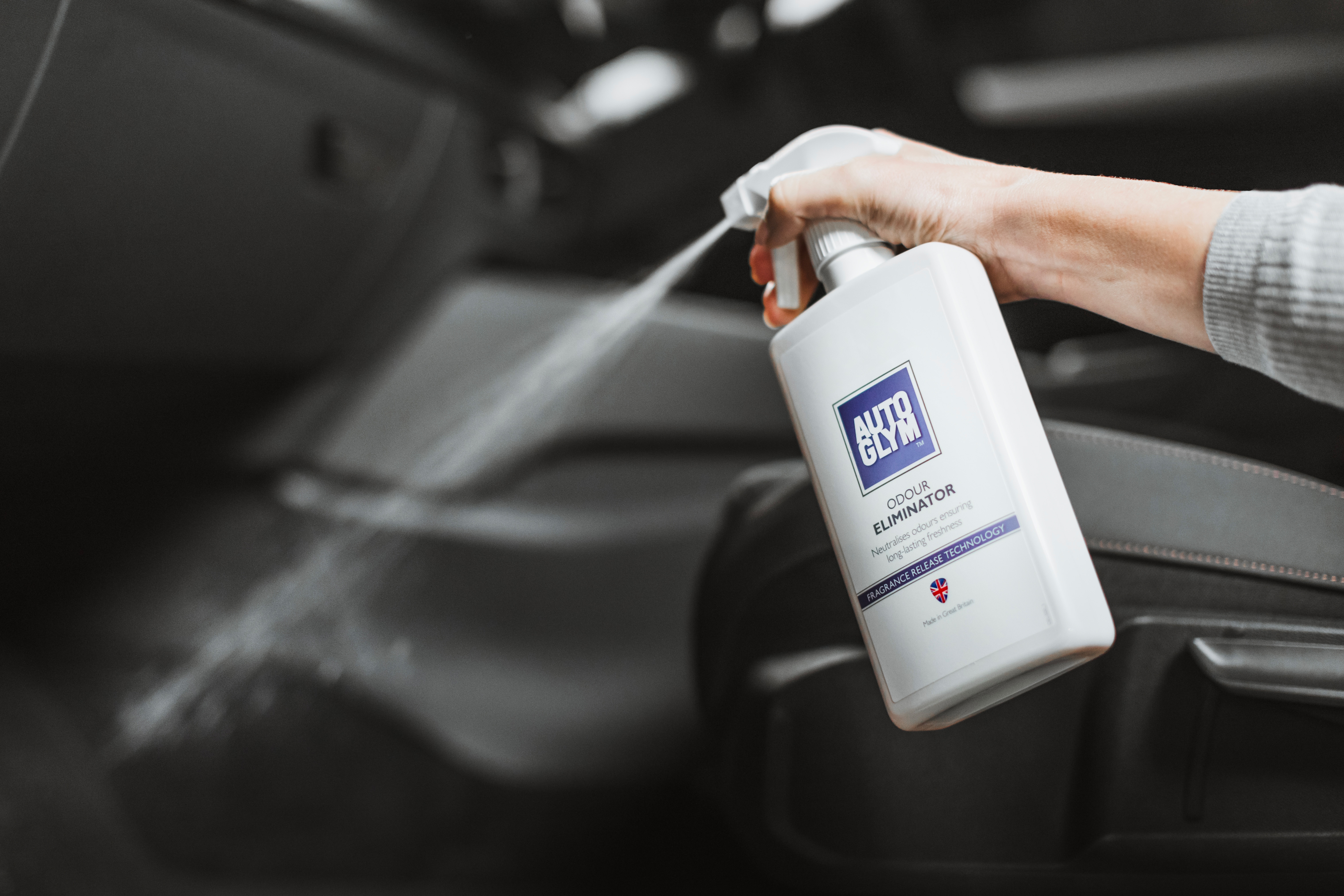 Kun pinnat on saatu puhtaaksi, kokonaisuuden voi viimeistellä Autoglym Odour Eliminatorilla, joka poistaa epämiellyttävät hajut eikä vain peitä niitä. Tuotetta voi suihkuttaa myös matoille ja istuinten väliin. Odour Eliminatorista on erityistä hyötyä, jos lomareissulla on ollut mukana lemmikkejä tai ruokaa.