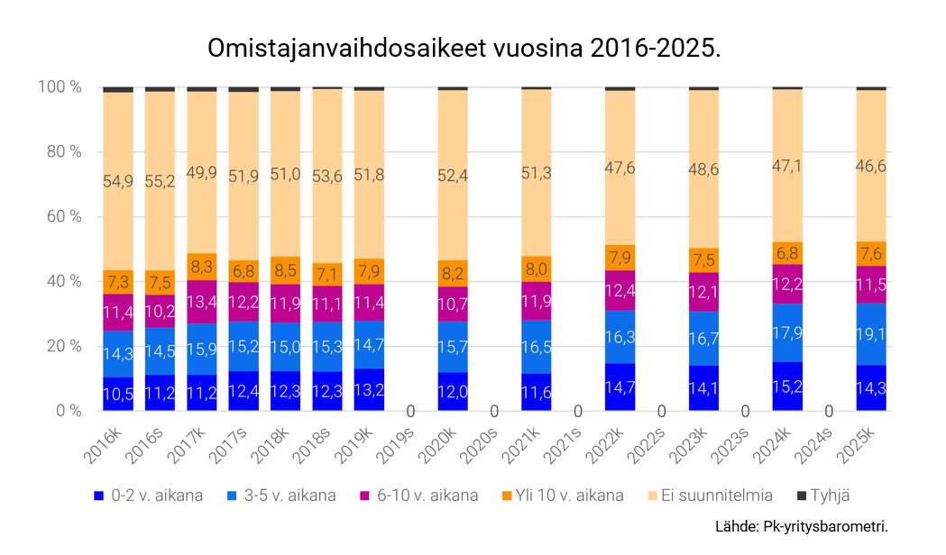 Tulevien viiden vuoden sisällä mahdollisesti myyntiin tulevia pk-yrityksiä on lähes kolme kertaa niin paljon kuin yritysostoa harkitsevia yrityksiä. Määrällinen epäsuhta on kasvanut viime vuosien aikana, ja mitä pidemmälle tulevaisuuteen suunnitellun omistajanvaihdoksen ajankohta menee, sitä suurempi on ero myynti- ja ostohalukkaiden yritysten määrissä. Tämä käy ilmi Pk-yritysbarometreista, joissa kartoitetaan säännöllisesti vastaajien suunnitelmia omistajanvaihdoksiin. Yrittäjistä reilu neljännes on 55–64-vuotiaita eli lähestyy eläkeikää. Huoli, ettei yrityksille löydy tarpeeksi jatkajia, on perusteltu. Samaan aikaan kuitenkin yrityskanta on tasaisessa kasvussa. Finnveran rahoitus omistajanvaihdoksiin näyttää kääntyneen alkuvuonna kasvuun.