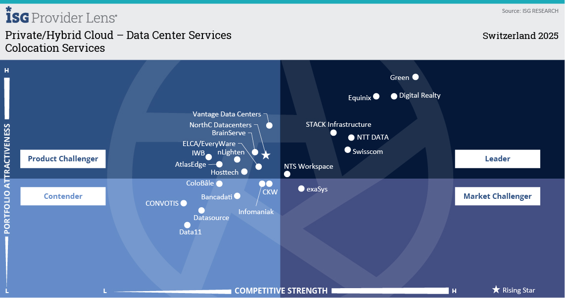 Lupfig, July 31, 2025 – ISG, a global AI-centered technology research and advisory firm, examined the Swiss data center market in its independent study "Private/Hybrid Cloud – Data Center Services 2025," published today. All providers were evaluated in a multi-stage survey. Green has once again achieved a leader status and has been positioned at the forefront of both quadrant dimensions – competitive strength and portfolio attractiveness – for the sixth consecutive year.