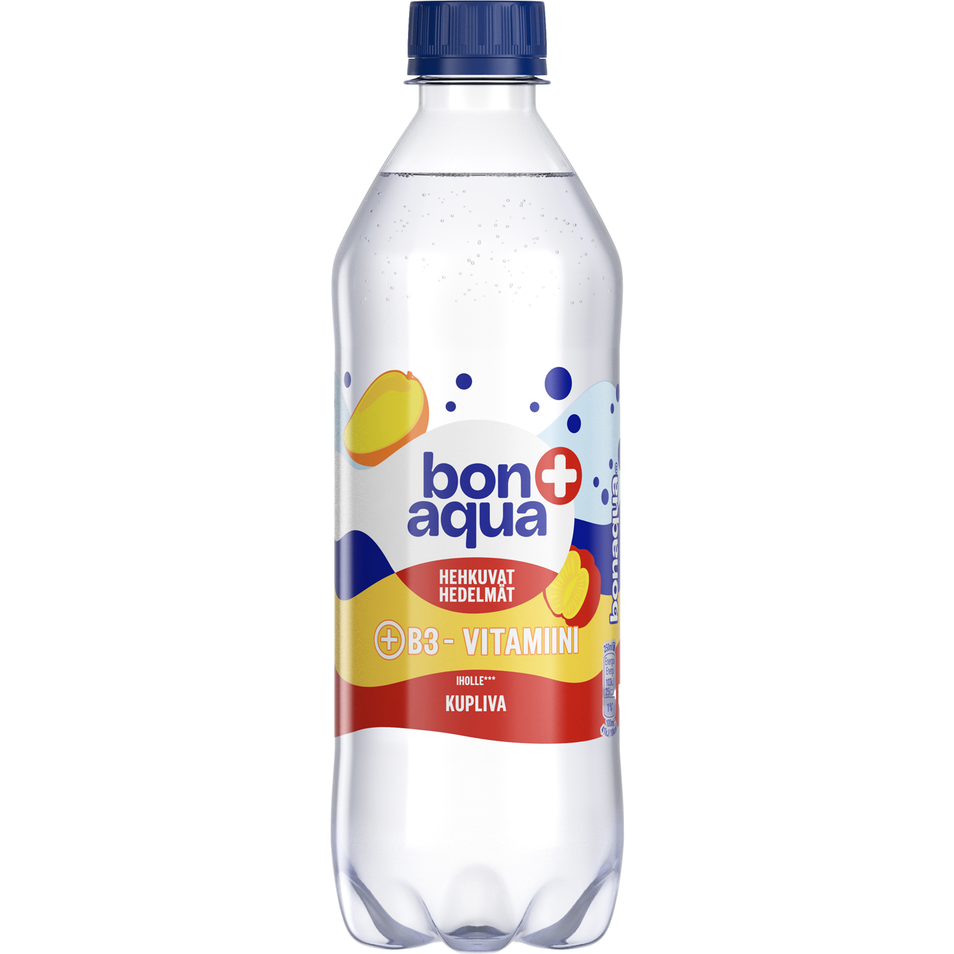 Bonaqua+ Hehkuvat hedelmät - herkullinen vesiuutuus maistuu mangolta ja acerolakirsikalta, ja siihen on lisätty B3-vitamiinia, mikä edistää ihon pysymistä normaalina.