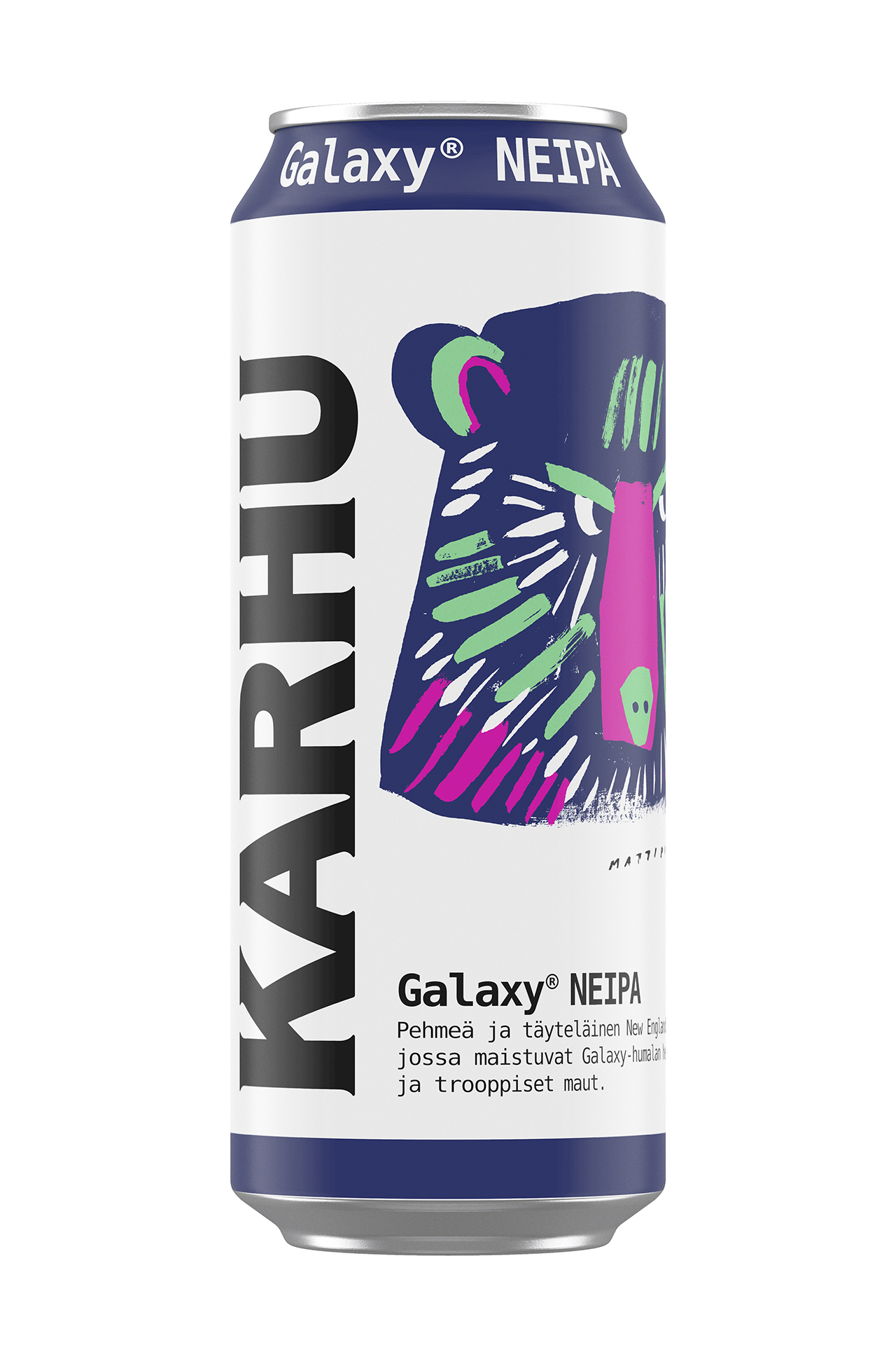Karhu Galaxy NEIPA 5,6% on pehmeä ja täyteläinen New England IPA, jossa maistuvat Galaxy-humalan hedelmäiset ja trooppiset maut. Tölkin revontulista inspiraationsa saaneen karhukuvan on luonut graafinen suunnittelija ja kuvittaja Matti Pikkujämsä.
